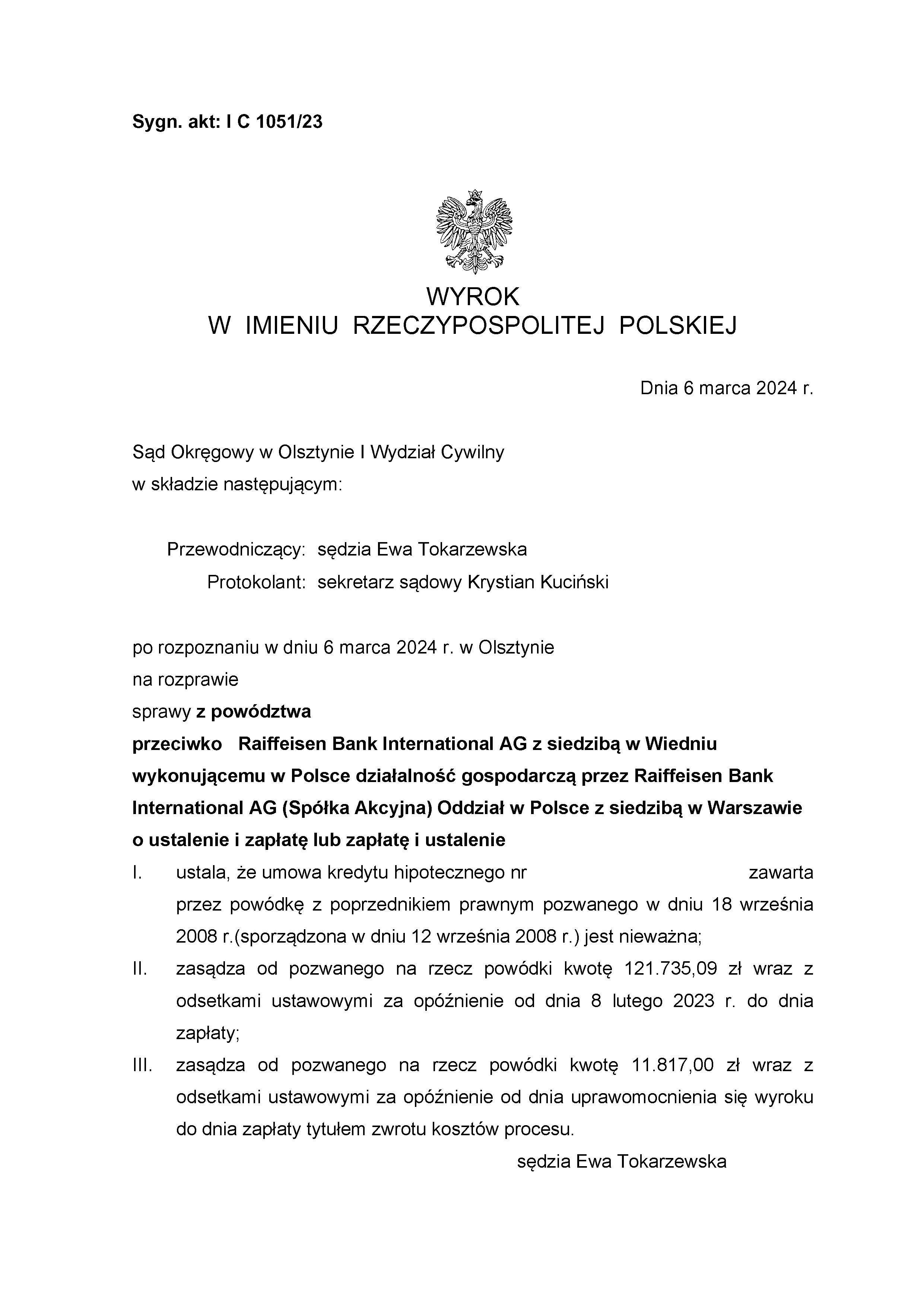 Sąd Okręgowy w Olsztynie I Wydział Cywilny wyrokiem z dnia 6 marca 2024 r., po rozpoznaniu sprawy z powództwa naszych klientów przeciwko Raiffeisen Bank ustalił że umowa kredytu powiązana z walutą CHF, zawarta między powodami a poprzednikiem prawnym pozwanego jest nieważna;