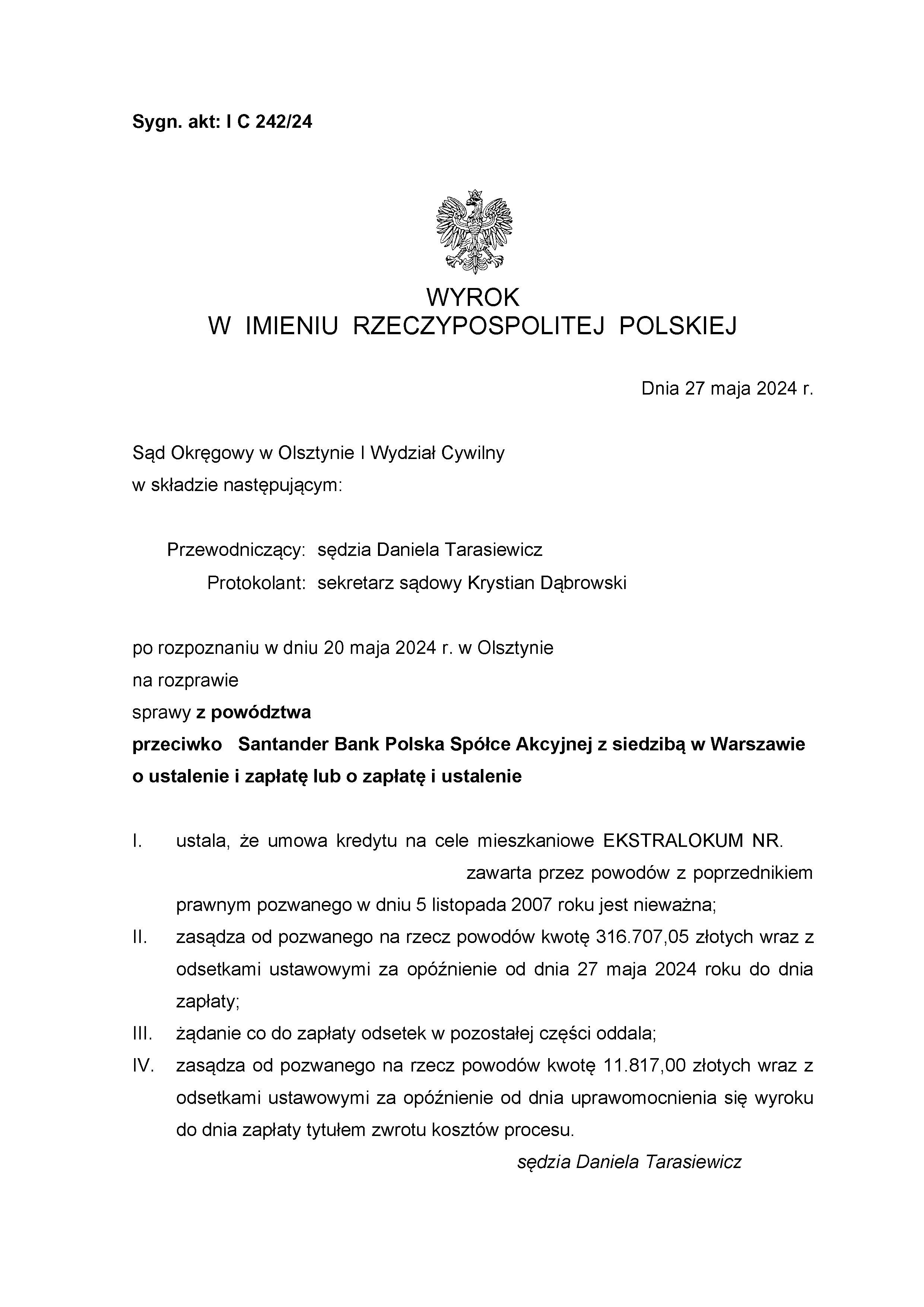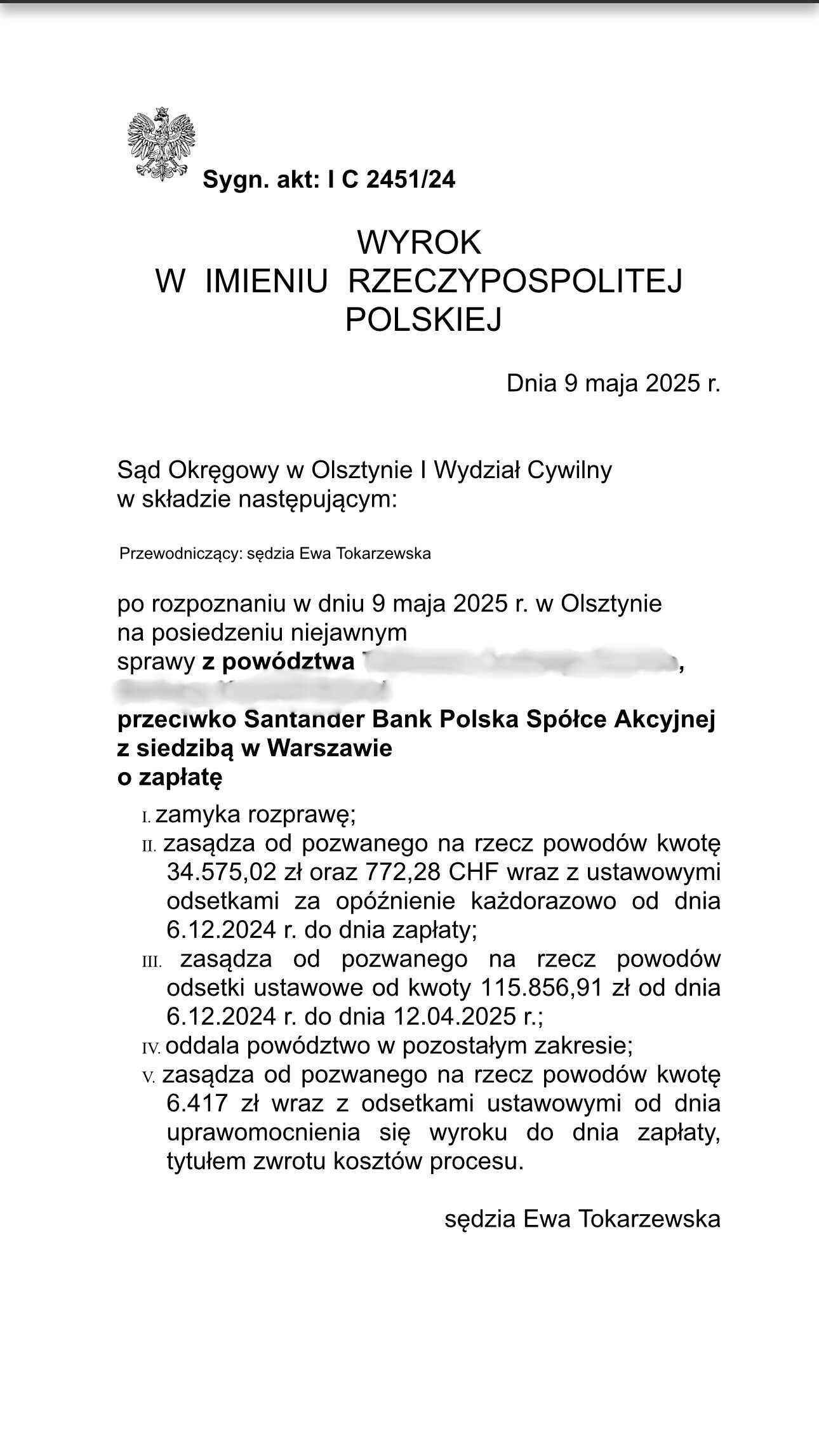 Sąd Okręgowy w Olsztynie I Wydział Cywilny wyrokiem z dnia 9 maja 2025 r., po rozpoznaniu sprawy z powództwa naszych Klientów przeciwko Bankowi Santander Bank Polska S.A. zasądził od pozwanego banku na rzecz Klientów Kancelarii kwotę 34 575,02 złotych, 772,28 chf oraz odsetki ustawowe od kwoty 115 856,91 zł od dnia 6 grudnia 2024 r. do dnia 12 kwietnia 2025 r. Sąd zasądził również 6 417,00 zł tytułem zwrotu kosztów procesu.