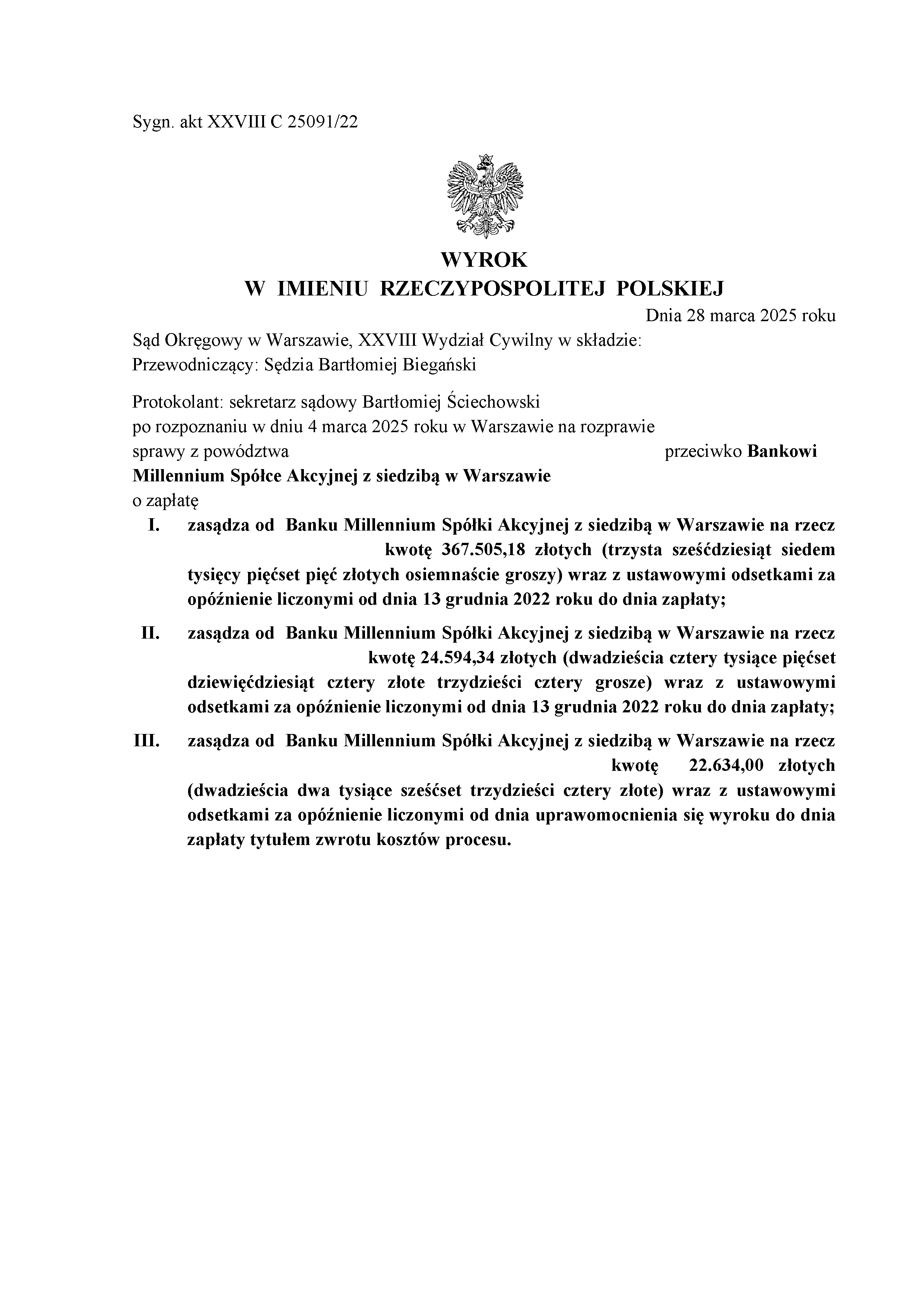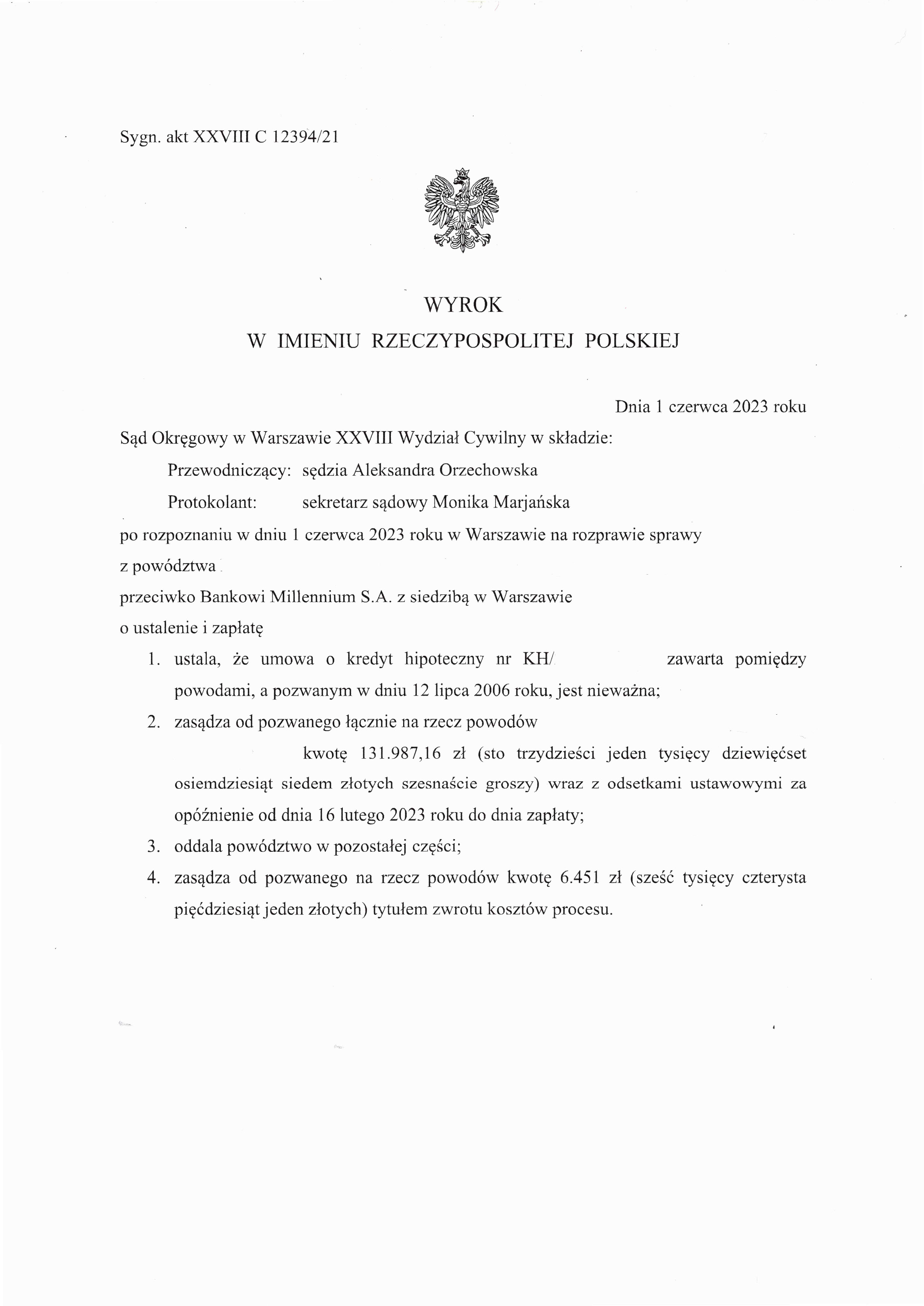Sąd Okręgowy w Warszawie XXVIII Wydział Cywilny po rozpoznaniu sprawy przeciwko Bankowi Millennium S.A. z siedzibą w Warszawie uznał, że umowa między naszymi klientami a bankiem jest nieważna.