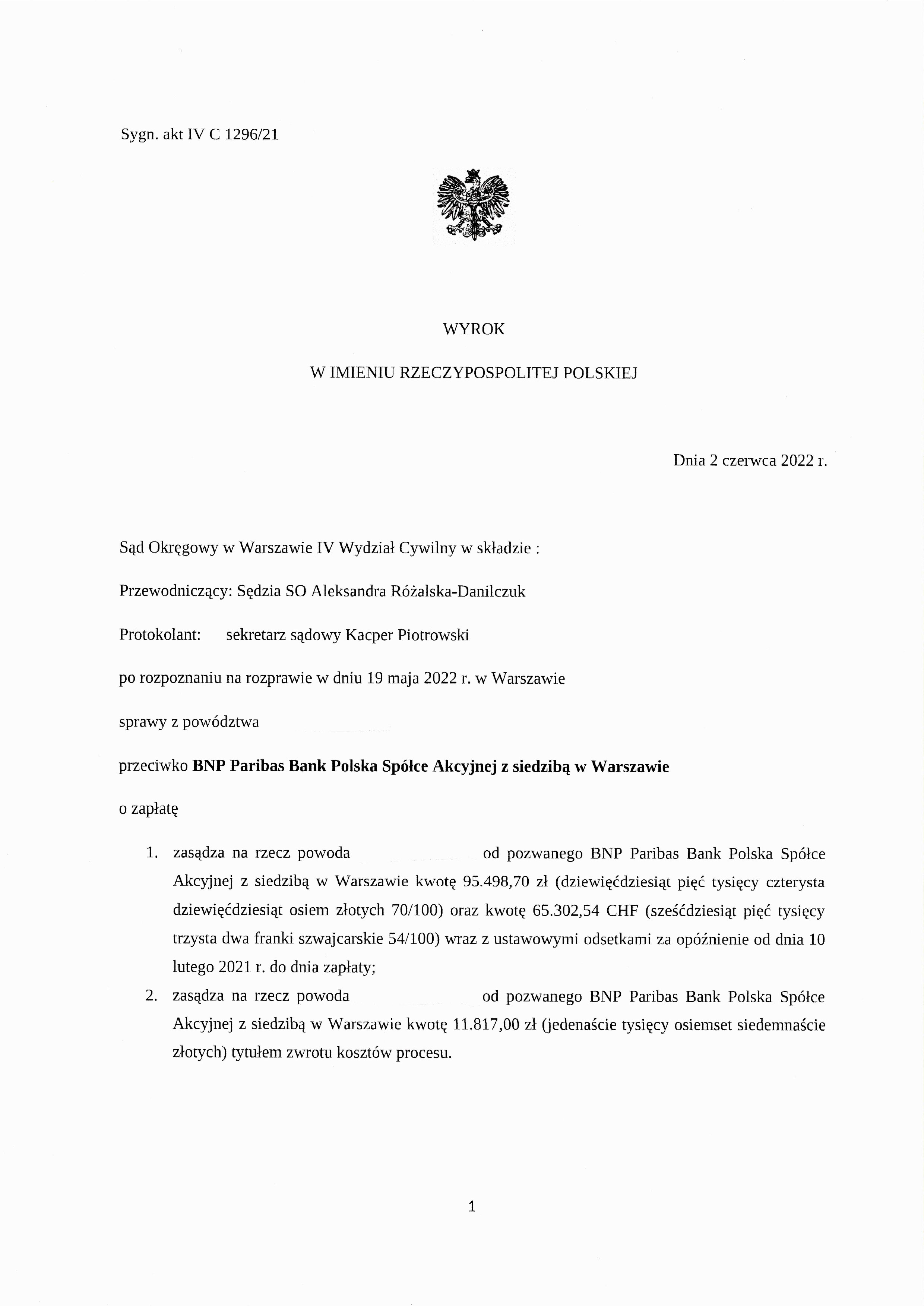 Sąd Okręgowy w Warszawie IV Wydział Cywilny po rozpoznaniu sprawy z powództwa naszego klienta przeciwko BNP Paribas Bank Polska S.A. zasądził na rzecz kredytobiorcy od pozwanego banku kwotę 95.498,70 zł oraz kwotę 65.302,54 CHF wraz z ustawowymi odsetkami za opóźnienie od wezwania do zapłaty.