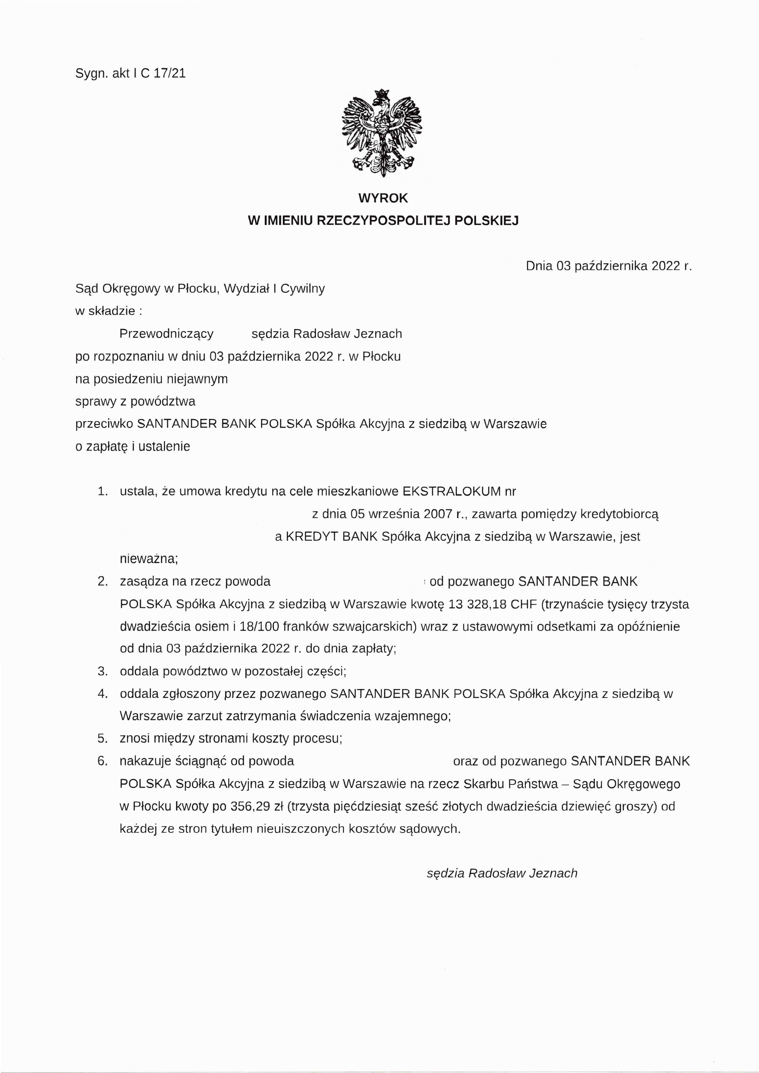 Sąd Okręgowy w Płocku, Wydział I Cywilny w dniu 3 października 2022 ustalił, że umowa kredytu na cele mieszkaniowe EKSTRALOKUM zawarta pomiędzy kredytobiorcą a KREDYT BANK S.A. jest nieważna oraz zasądził na rzecz powoda od banku SANTANDER BANK POLSKA S.A. kwotę 13 328,18 CHF wraz z ustawowymi odsetkami za opóźnienie.