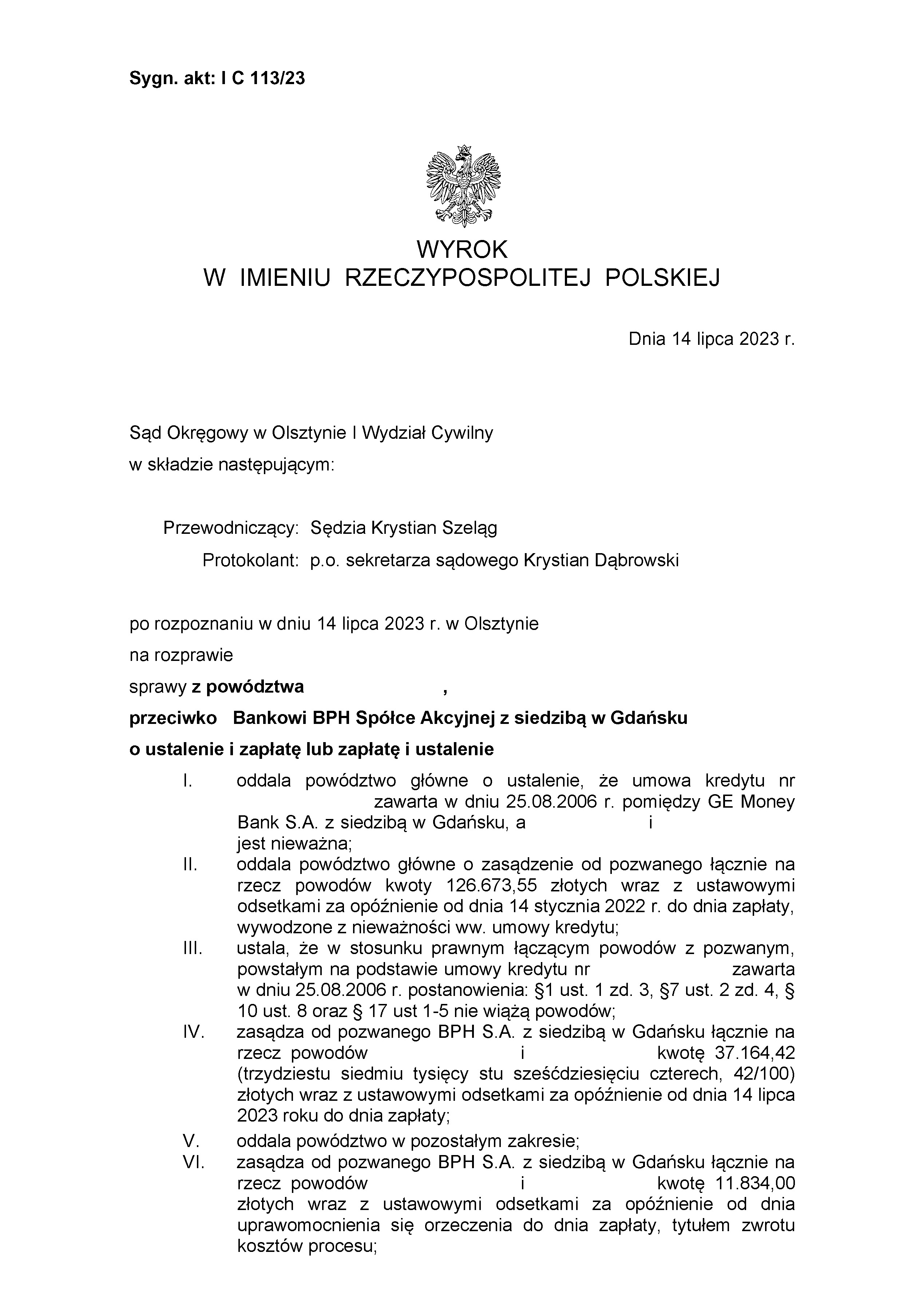 Sąd Okręgowy w Olsztynie I Wydział Cywilny wyrokiem z dnia 14 lipca 2023 r., po rozpoznaniu sprawy z powództwa naszych klientów przeciwko Bankowi BPH S.A. (dawniej GE Money Bank S.A.) odfrankowił umowę kredytową i zasądził od banku na rzecz powodów kwotę 37.164,42 zł wraz z ustawowymi odsetkami za opóźnienie oraz kwotę 11.834,00 zł tytułem zwrotu kosztów procesu. Postępowanie sądowe od złożenia pozwu do ogłoszenia wyroku trwało zaledwie 5 i pół miesiąca! wraz z odsetkami ustawowymi za opóznienie. Postepowanie sadowe trwalo 15 miesiecy