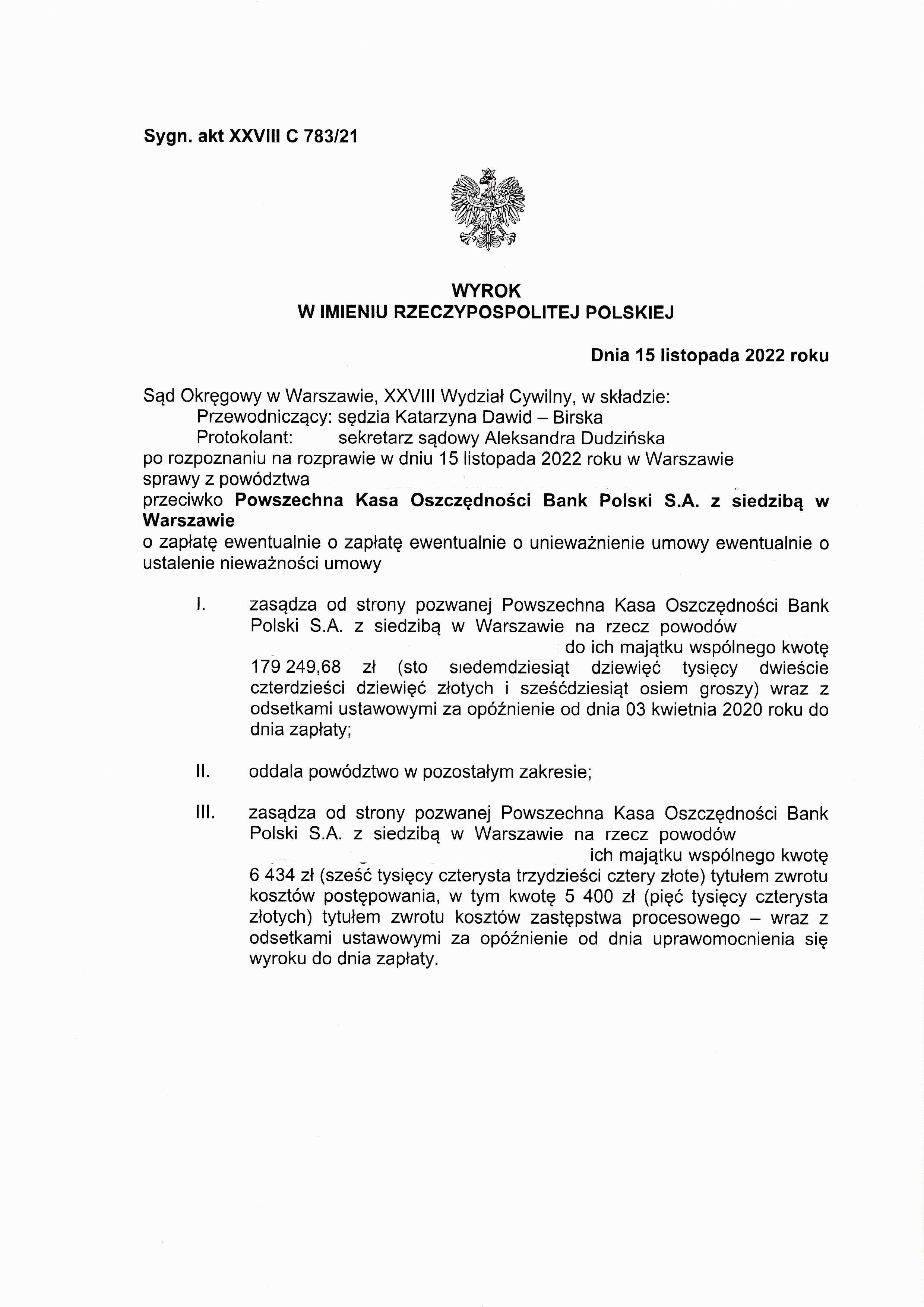 Sąd Okręgowy w Warszawie, XXVIII Wydział Cywilny po rozpoznaniu na rozprawie w dniu 15 listopada 2022 roku w Warszawie sprawy z powództwa naszych Klientów przeciwko PKO BP S.A. orzekł zasądzenie od strony pozwanej Powszechna Kasa Oszczędności Bank Polski S.A. z siedzibą w Warszawie na rzecz powodów kwotę 179 249,68 zł.