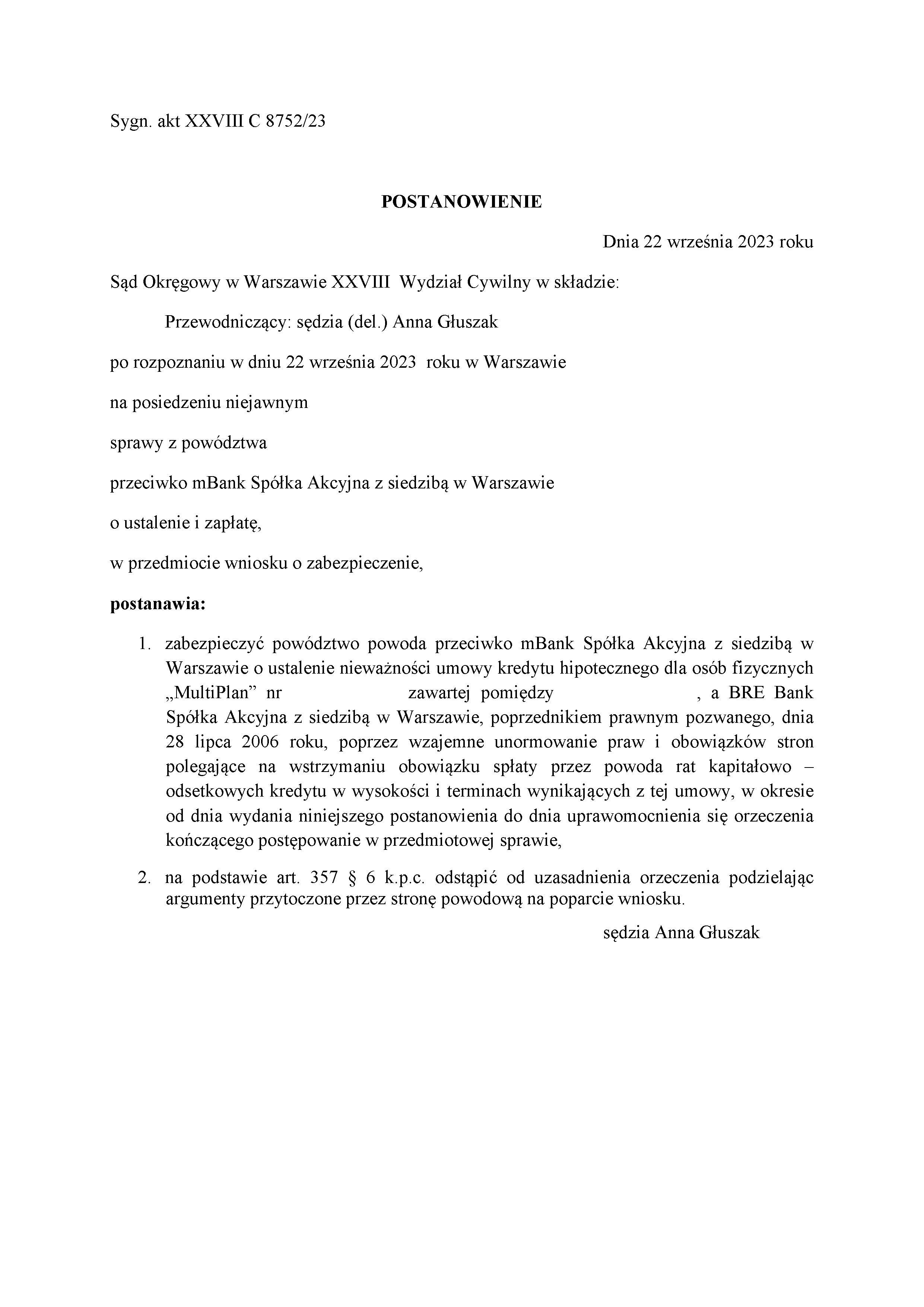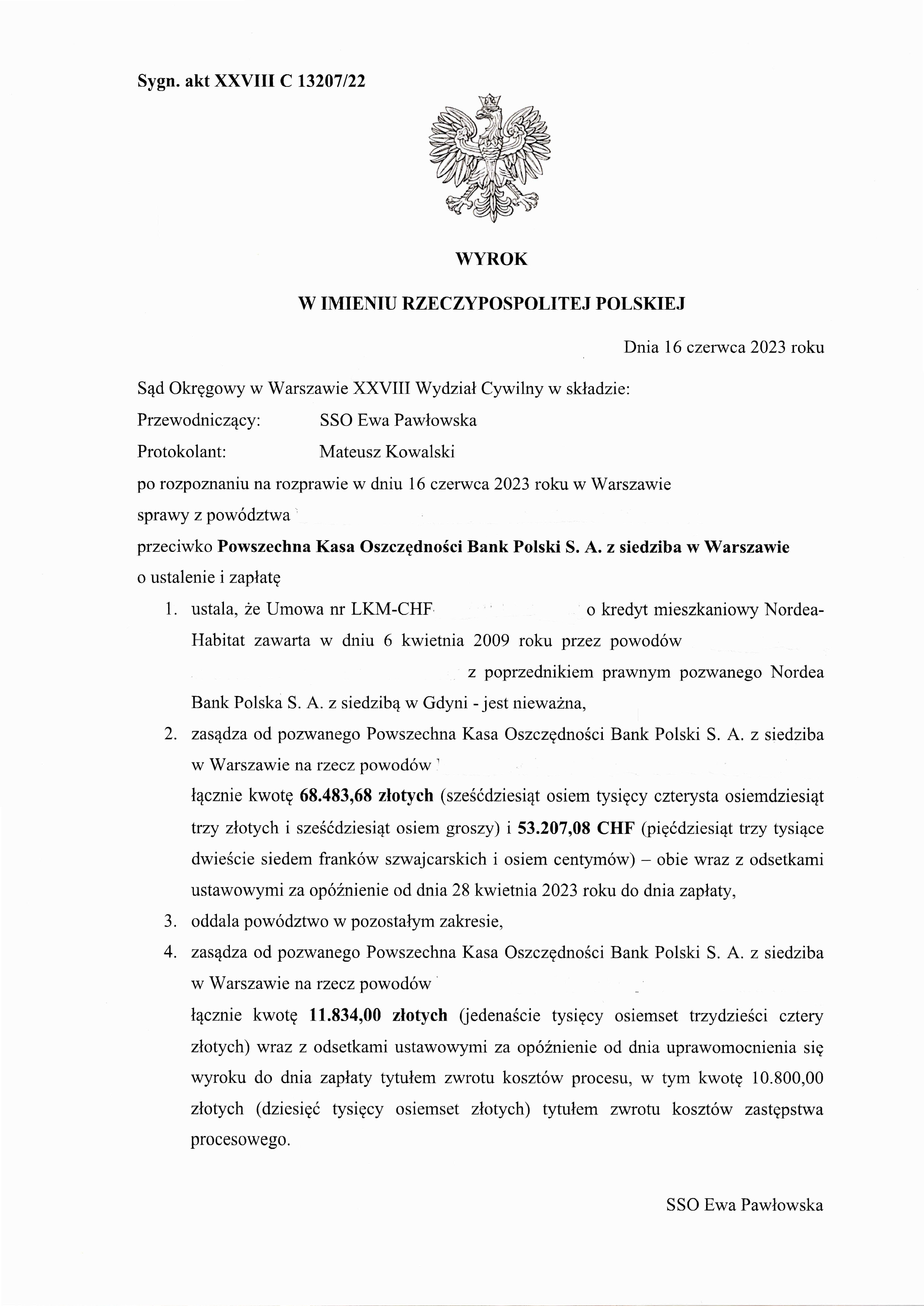 Dnia 16 czerwca 2023 roku Sad Okregowy w Warszawie XXVIII Wydzial Cywilny, po rozpoznaniu na rozprawie w dniu 16 czerwca 2023 roku w Warszawie sprawy z powództwa naszych klientów przeciwko Powszechna Kasa Oszczednosci Bank Polski S. A. ustalil, ze Umowa o kredyt mieszkaniowy Nordea Habitat zawarta w dniu 6 kwietnia 2009 roku przez powodów z poprzednikiem prawnym pozwanego Nordea Bank Polska S. A. jest niewazna.