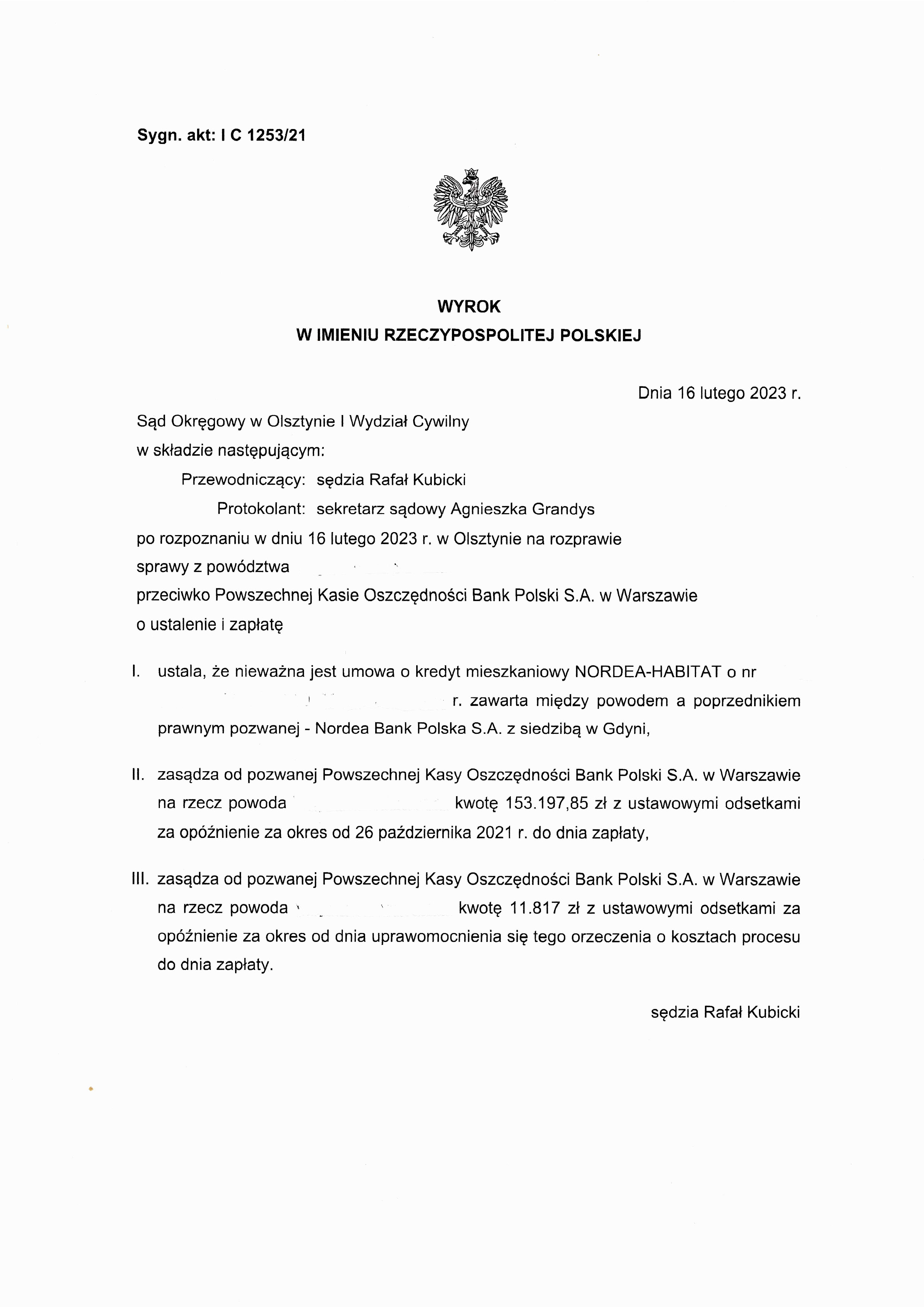 Sąd Okręgowy w Olsztynie I Wydział Cywilny po rozpoznaniu w dniu 16 lutego 2023 r. w Olsztynie na rozprawie ustalił że nieważna jest umowa o kredyt mieszkaniowy NORDEA-HABITAT zawarta między powodem a Nordea Bank Polska S.A.