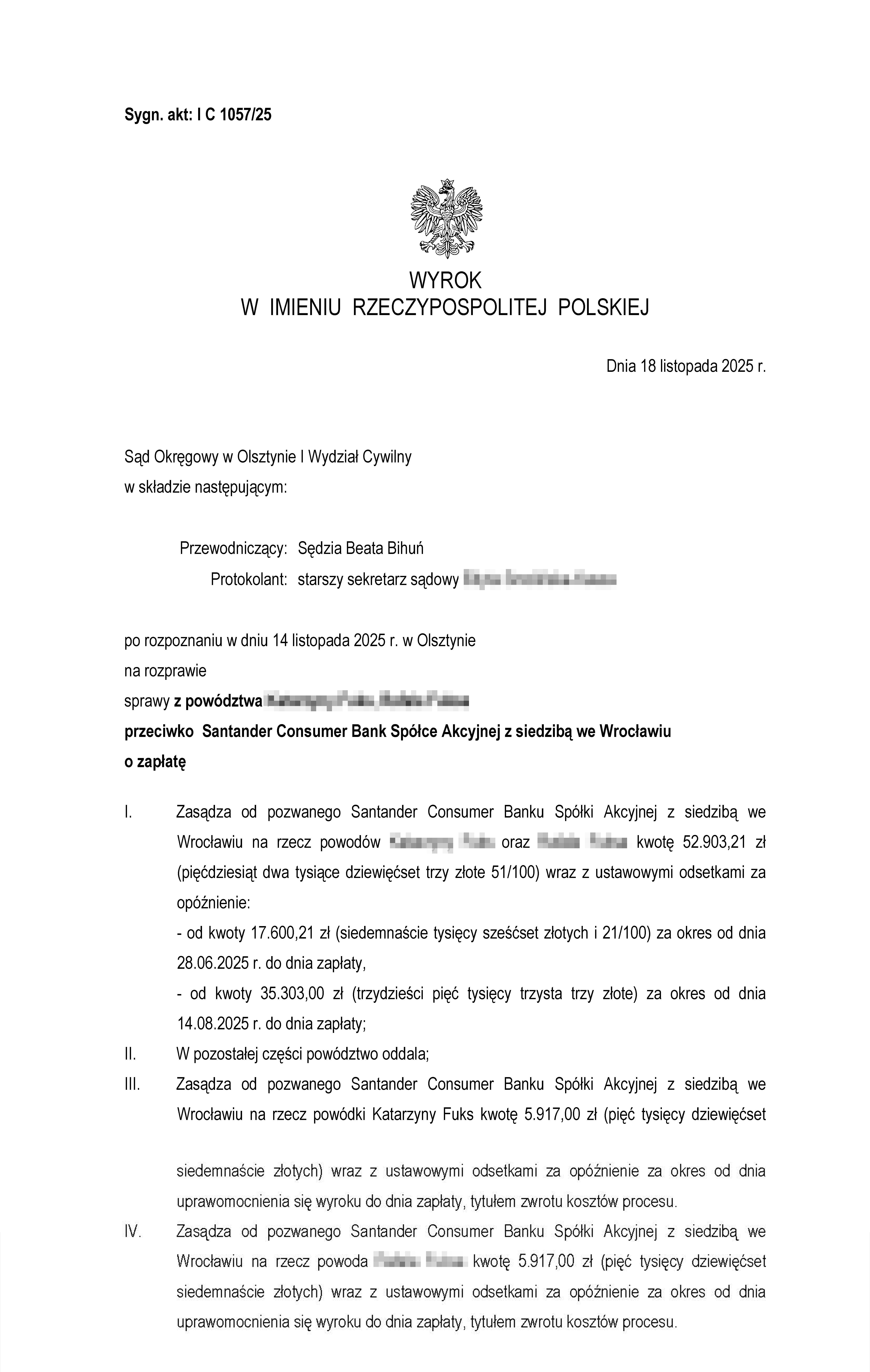 Sąd Okręgowy w Olsztynie, I Wydział Cywilny wyrokiem z dnia 18 listopada 2025 r., po rozpoznaniu sprawy z powództwa naszego klienta przeciwko Bankowi Santander Consumer Bank Spółka Akcyjna, zasądził od pozwanego banku na rzecz Klientów Kancelarii kwoty 17 600,21 zł wraz z odsetkami ustawowymi za opóźnienie od dnia 28 czerwca 2025 r. do dnia zapłaty oraz 35 303,00 zł wraz z odsetkami ustawowymi za opóźnienie od dnia 14 sierpnia 2025 r. do dnia zapłaty. Sąd zasądził również 11 834,00 złotych tytułem zwrotu kosztów procesu. Sprawa dotyczyła spłaconego kredytu.