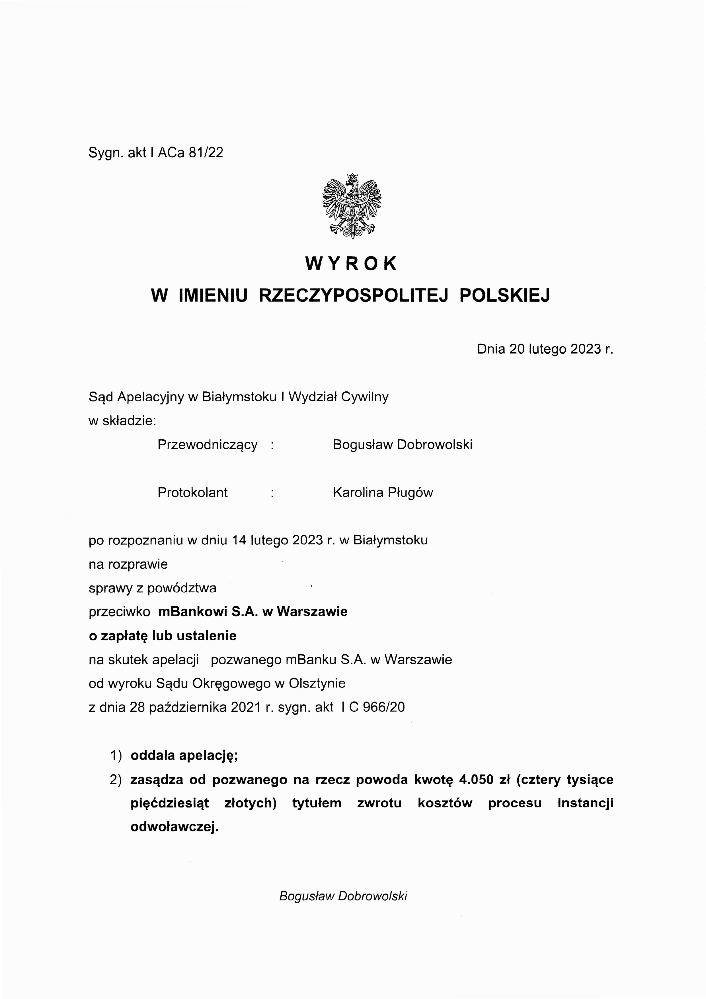 Sąd Apelacyjny w Białymstoku I Wydział Cywilny po rozpoznaniu w dniu 14 lutego 2023 r. w Białymstoku na rozprawie sprawy z powództwa naszego klienta przeciwko mBankowi S.A. w Warszawie na skutek apelacji pozwanego mBanku S.A. w Warszawie od wyroku Sądu Okręgowego w Olsztynie z dnia 28 października 2021 r. sygn. akt I C 966/20 oddalił apelację i zasądził od pozwanego na rzecz powoda koszty procesu instancji odwoławczej.