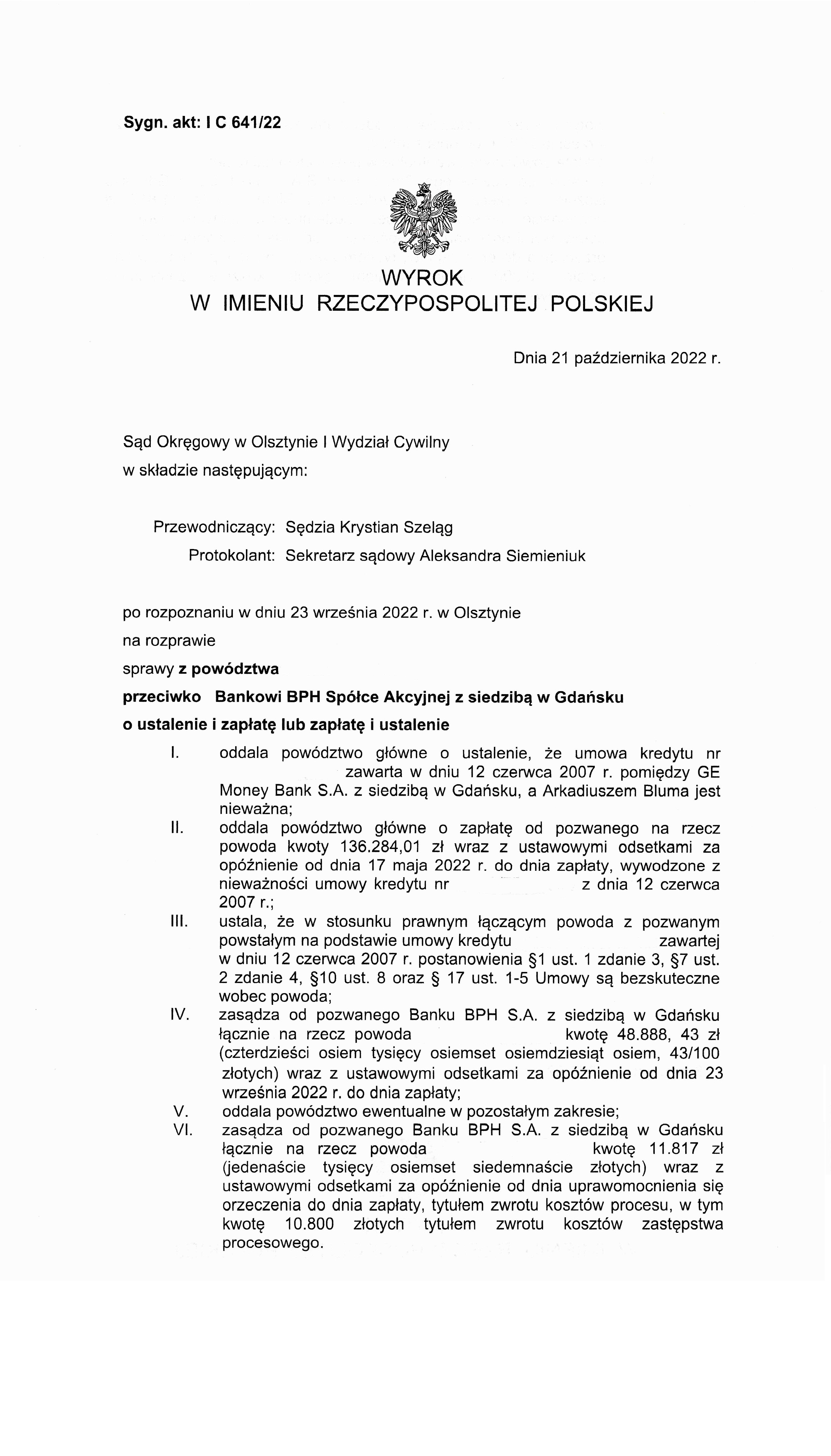Sąd Okręgowy w Olsztynie I Wydział Cywilny wyrokiem z dnia 21 października 2022 r., po rozpoznaniu sprawy z powództwa naszego klienta przeciwko Bankowi BPH S.A. (dawniej GE Money Bank S.A.) odfrankowił umowę kredytową i zasądził od banku na rzecz powoda kwotę 48.888, 43 zł wraz z ustawowymi odsetkami za opóźnienie.