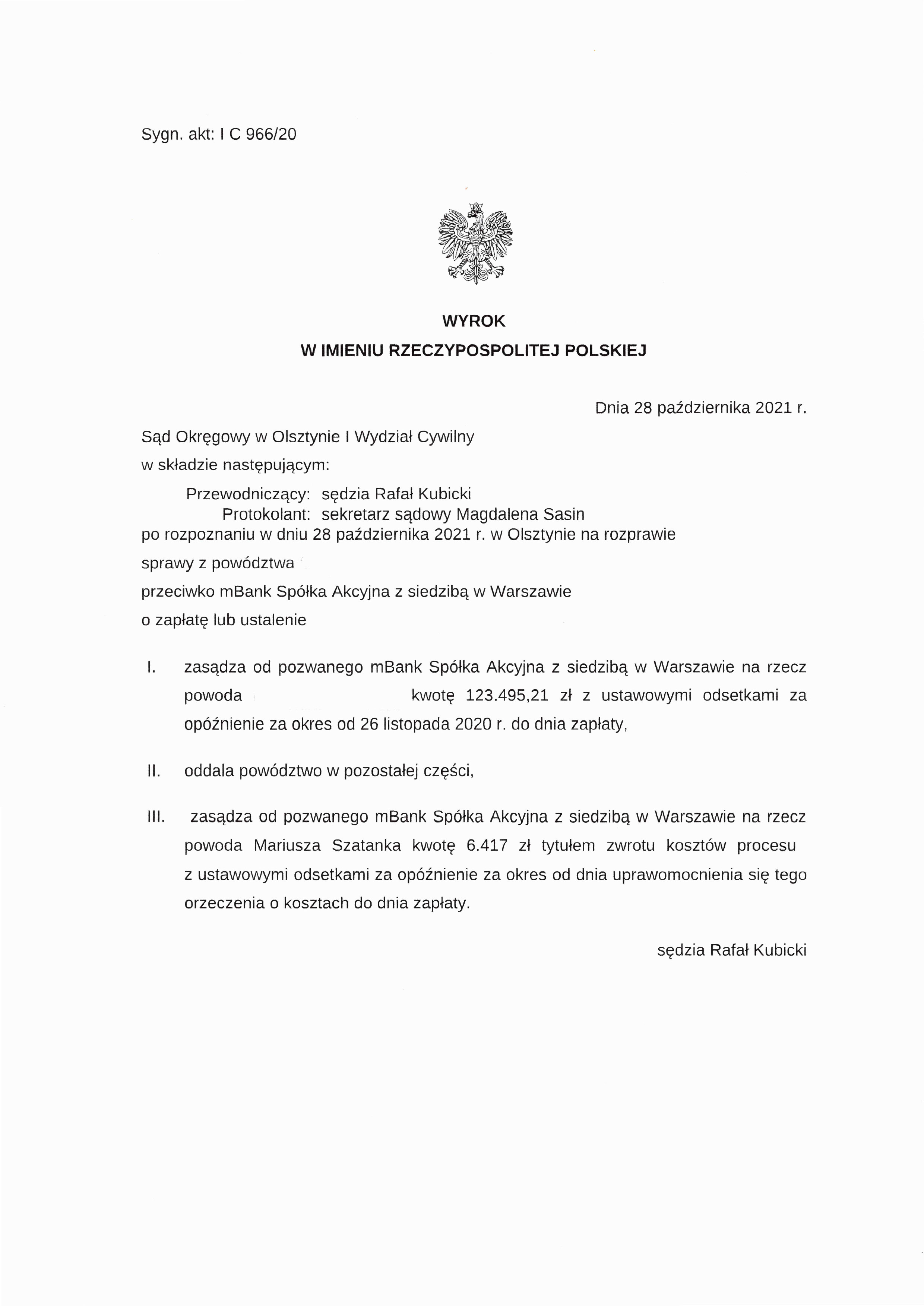 Dnia 28 października 2021 r. Sąd Okręgowy w Olsztynie I Wydział Cywilny zasądził od pozwanego mBank S.A. z siedzibą w Warszawie na rzecz powoda kwotę 123.495,21 zł z ustawowymi odsetkami za opóźnienie za okres od wezwania banku do zapłaty.