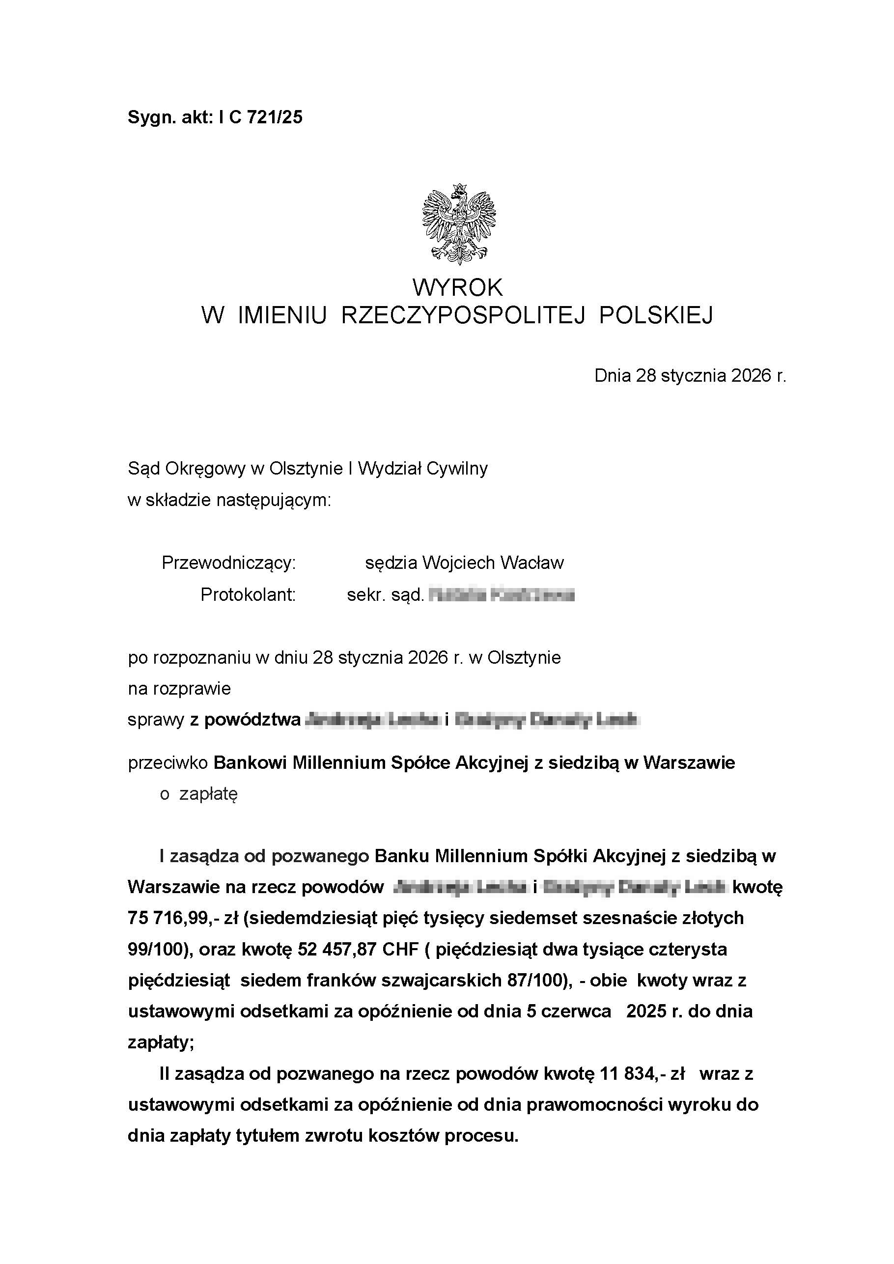 Sąd Okręgowy w Olsztynie I Wydział Cywilny wyrokiem z dnia 28 stycznia 2026 r., po rozpoznaniu sprawy z powództwa naszego klienta przeciwko Bankowi Millenium Spółka Akcyjna, zasądził od pozwanego banku na rzecz Klientów Kancelarii kwoty 75 716,99 zł oraz 52 457,87 CHF wraz z odsetkami ustawowymi za opóźnienie od dnia 5 czerwca 2025 r. do dnia zapłaty. Sąd zasądził również 11 834,00 złotych tytułem zwrotu kosztów procesu. Sprawa dotyczyła spłaconego kredytu.