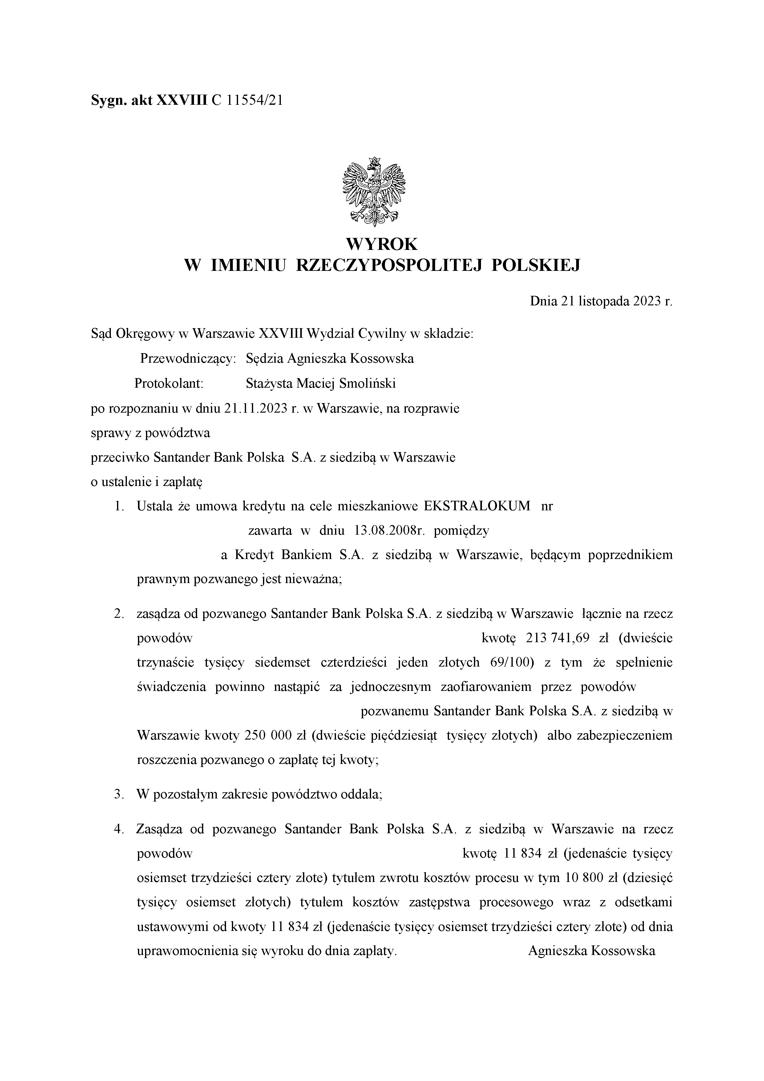 Sąd zasądził od pozwanego banku łącznie na rzecz powodów kwotę 213 741,69 zł oraz kwotę 11.834,00 zł tytułem zwrotu kosztów procesu.