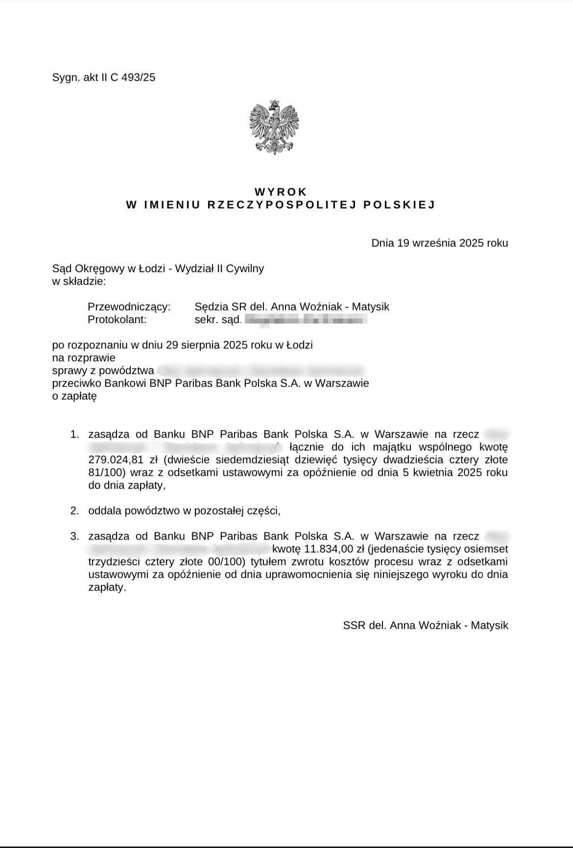 2025 r., po rozpoznaniu sprawy z powództwa naszego klienta przeciwko Bankowi