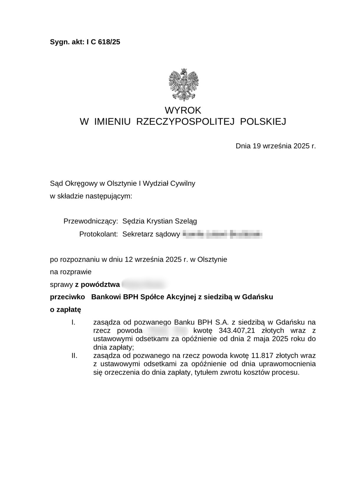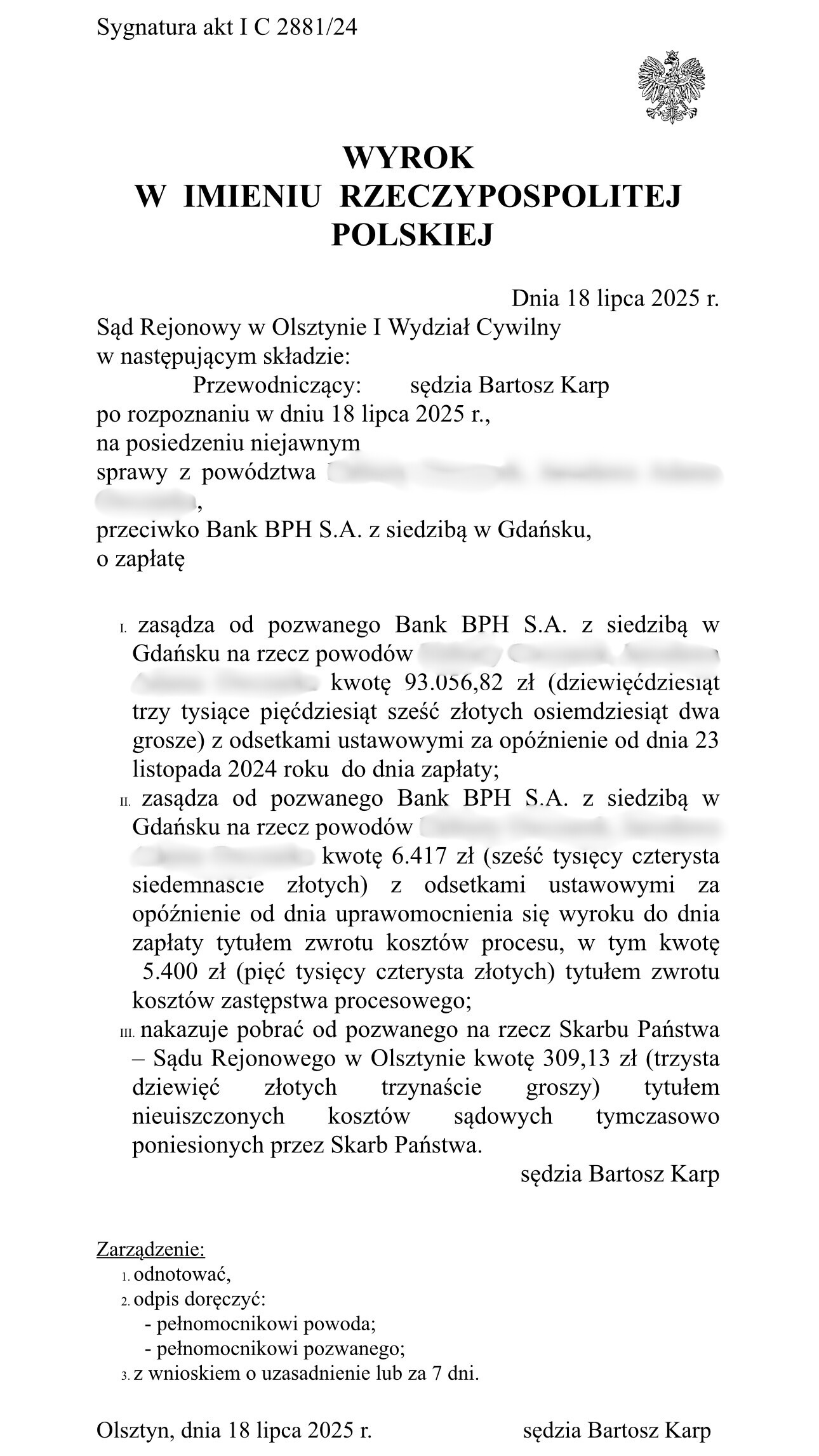 Sąd Rejonowy w Olsztynie I Wydział Cywilny wyrokiem z dnia 18 lipca 2025 r., po rozpoznaniu sprawy z powództwa naszych Klientów przeciwko Bankowi BPH S.A. zasądził od pozwanego banku na rzecz Klientów Kancelarii kwoty 93 056,82 złotych z odsetkami ustawowymi za opóźnienie od dnia 23 listopada 2024 r. do dnia zapłaty. Sąd zasądził również 6 417,00 zł z odsetkami ustawowymi za opóźnienie od dnia uprawomocnienia się wyroku do dnia zapłaty tytułem zwrotu kosztów procesu, w tym kwotę 5 400,00 zł tytułem zwrotu kosztów zastępstwa procesowego.