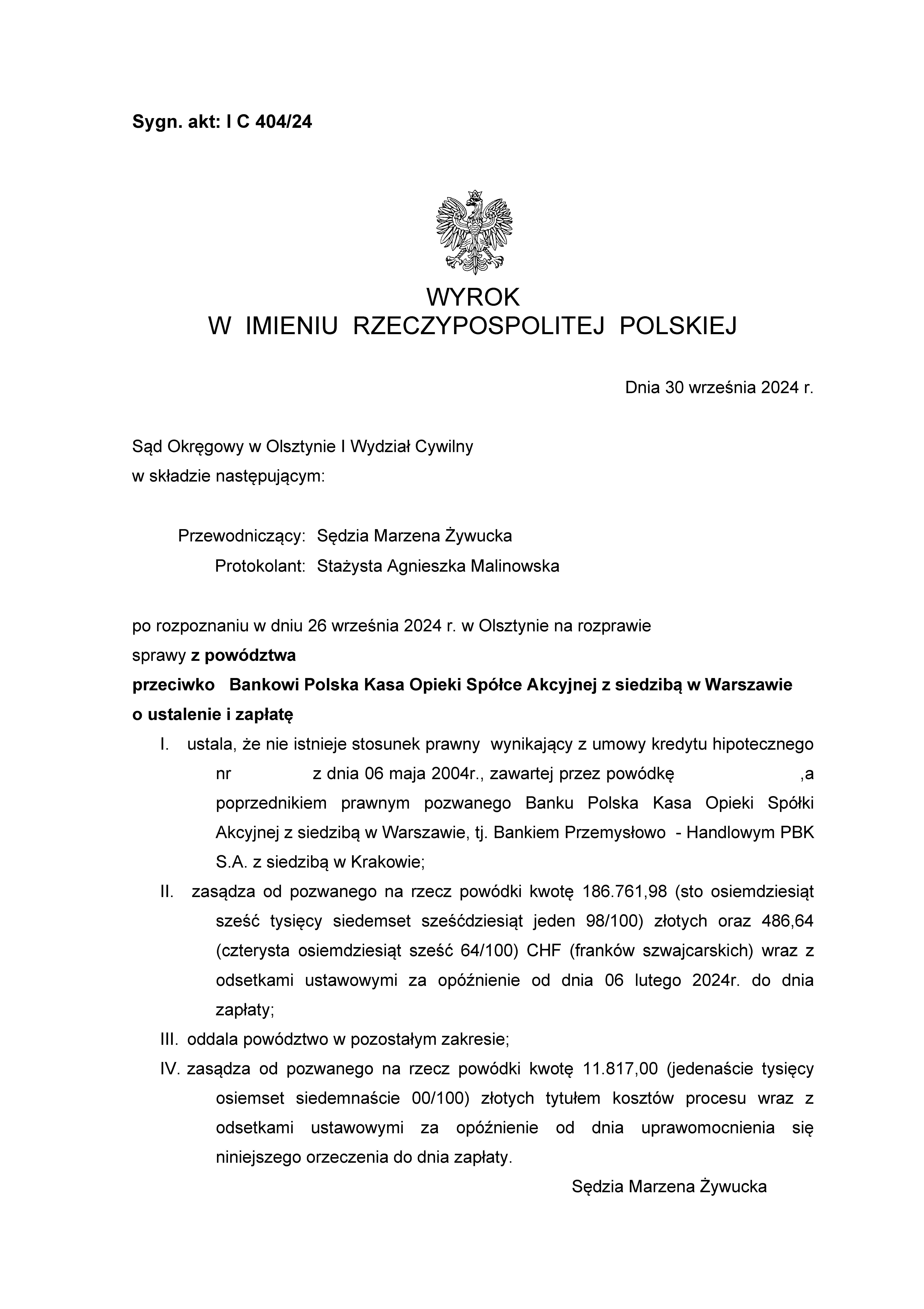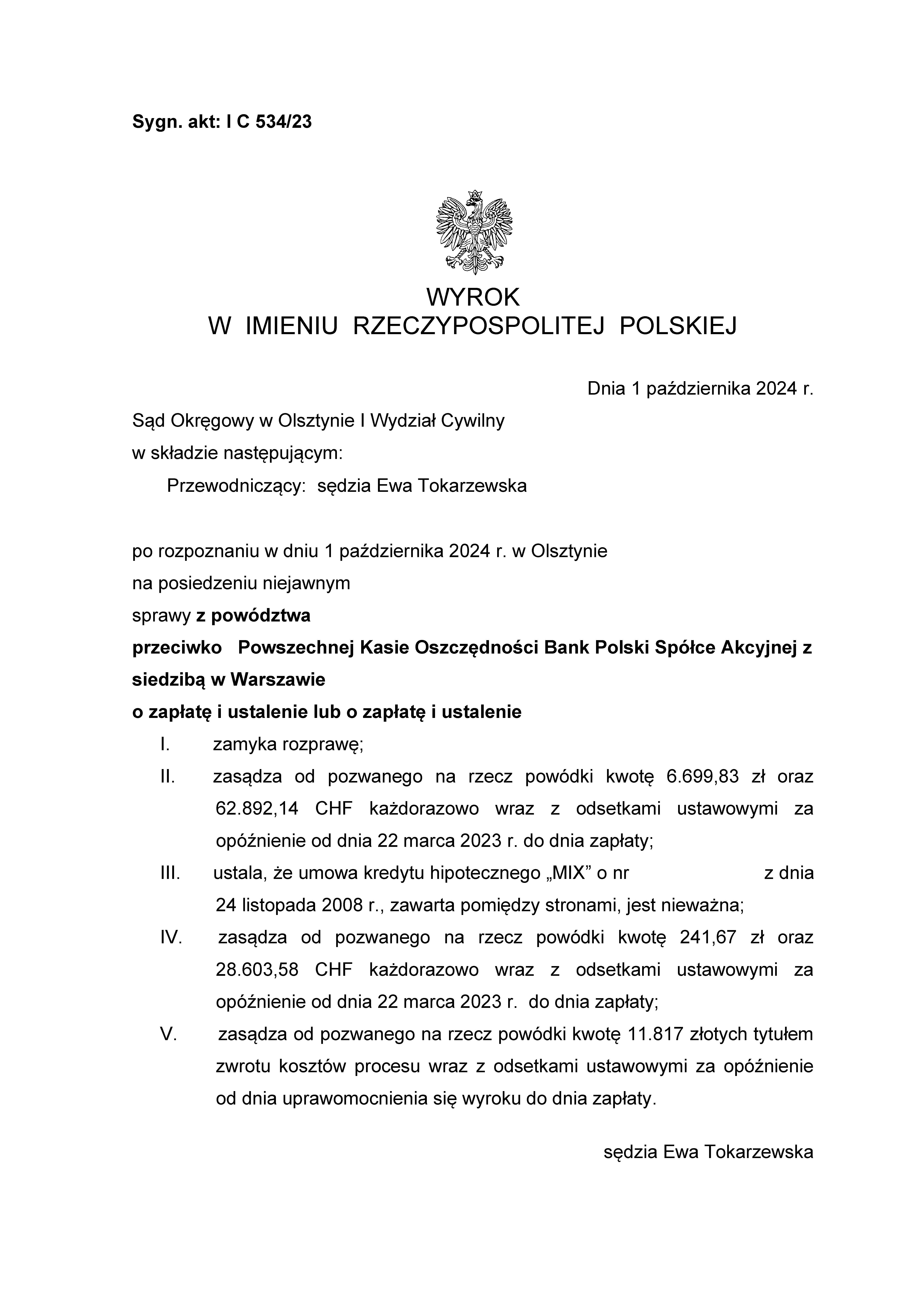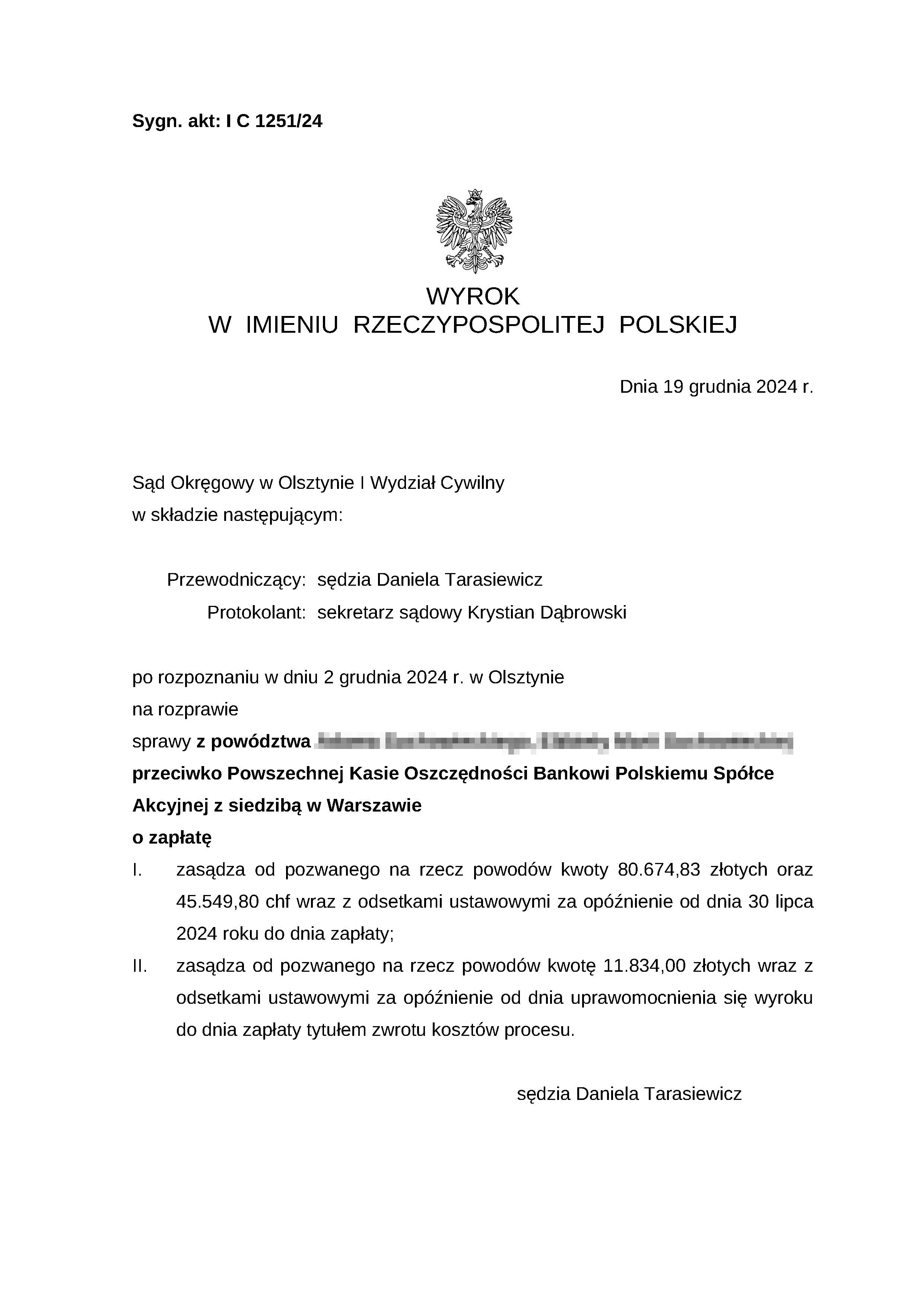 Sąd Okręgowy w Olsztynie I Wydział Cywilny wyrokiem z dnia 19 grudnia 2024 r., po rozpoznaniu sprawy z powództwa Klientów Kancelarii przeciwko bankowi Powszechna Kasa Oszczędności s.a. zasądził od pozwanego banku kwoty 80.674,83 złotych oraz 45.549,80 chf wraz z odsetkami ustawowymi za opóźnienie od dnia 30 lipca 2024 roku do dnia zapłaty. Sąd zasądził również 11.817,00 złotych tytułem zwrotu kosztów procesu. Sprawa dotyczyła spłaconego kredytu.