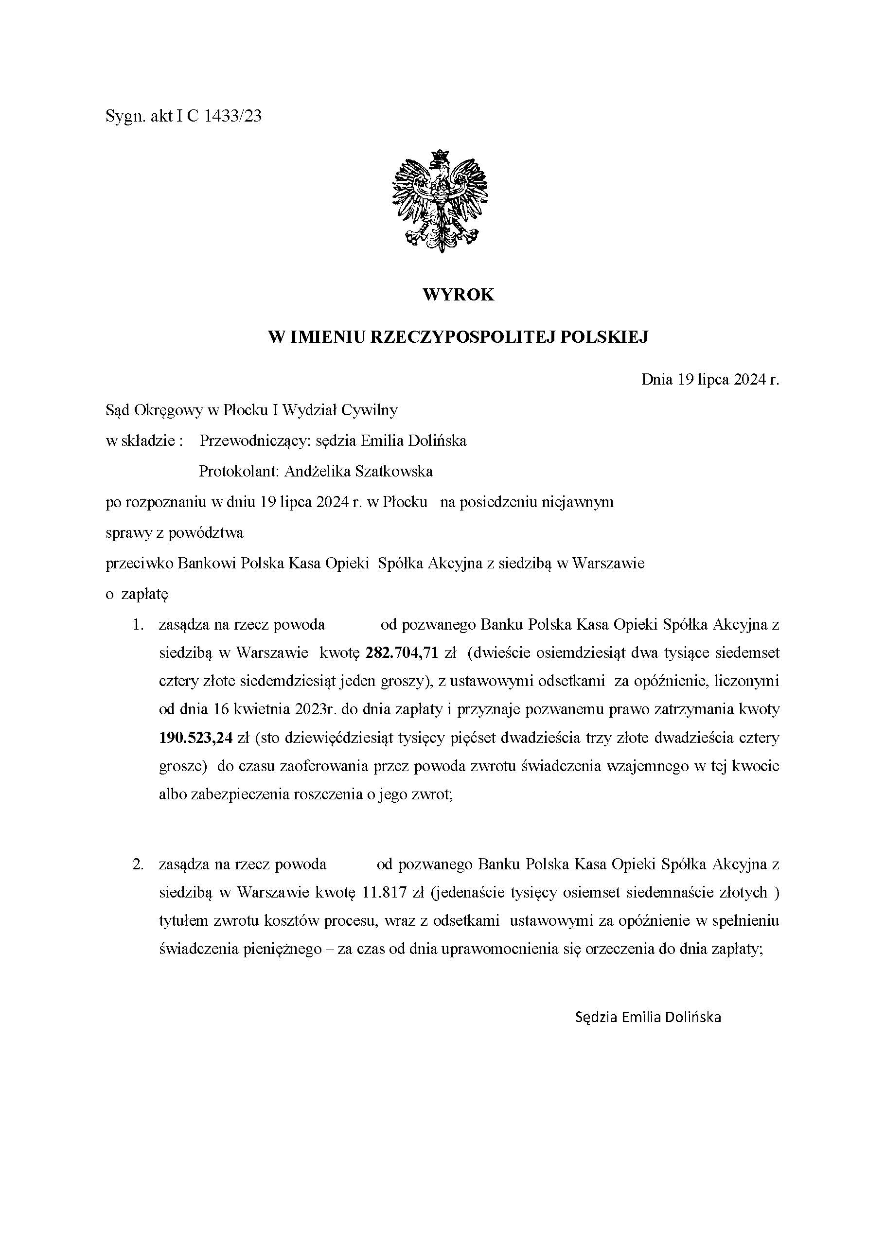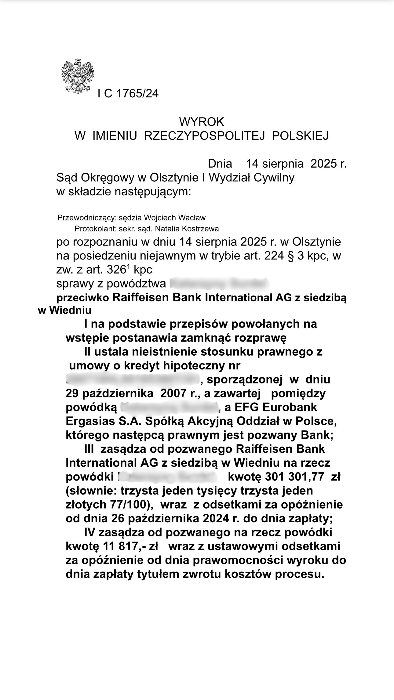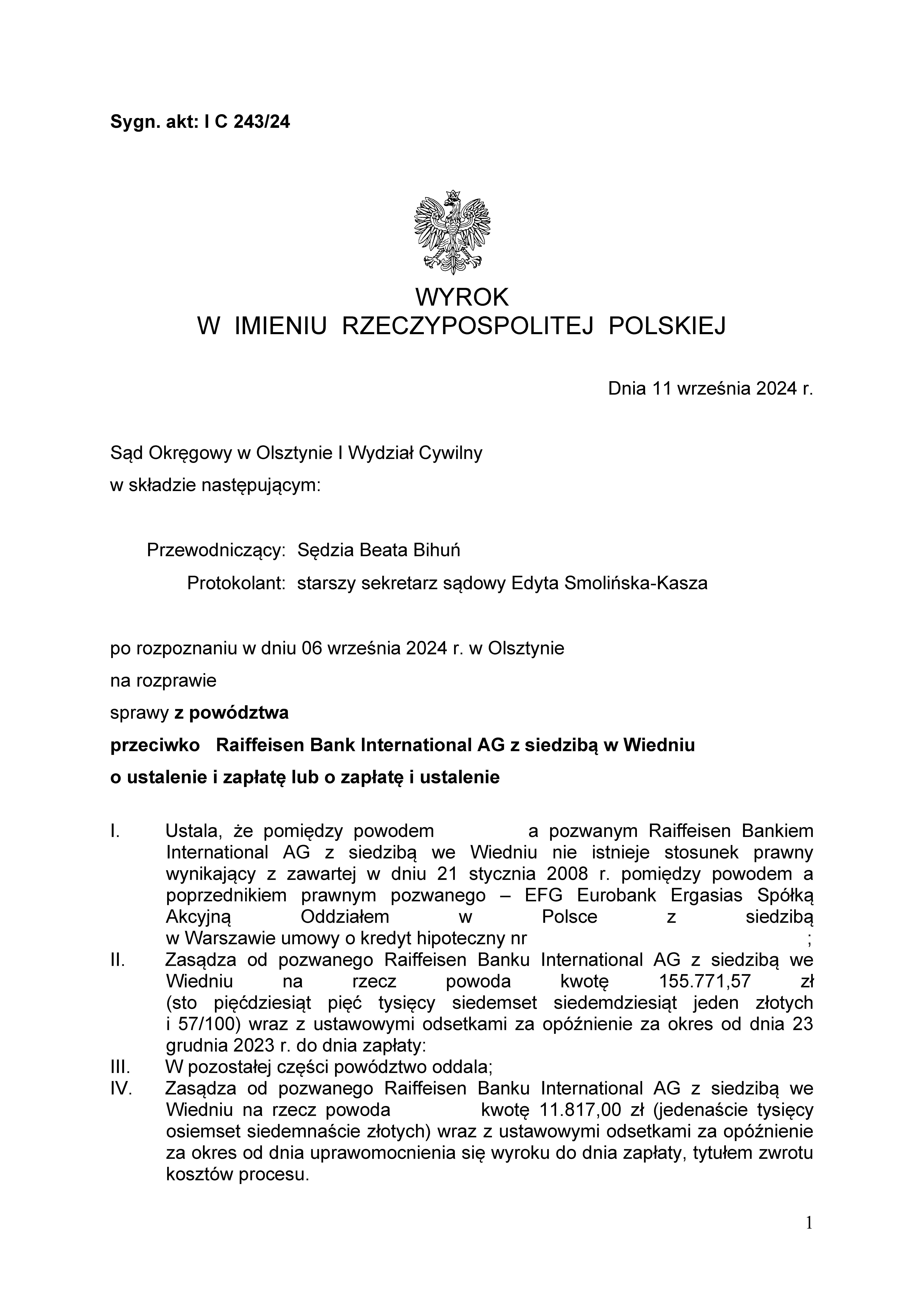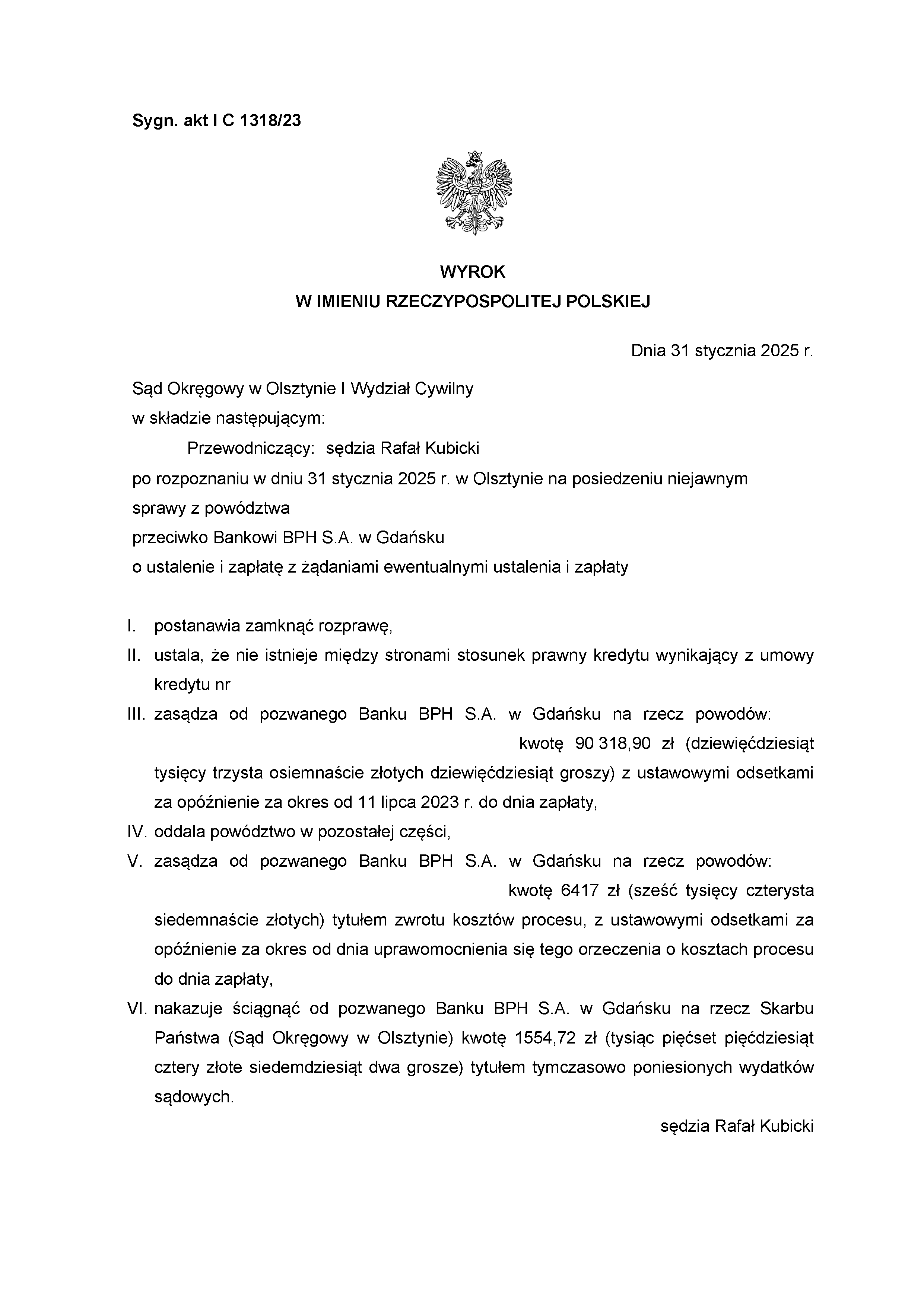 Sąd Okręgowy w Olsztynie I Wydział Cywilny wyrokiem z dnia 19 grudnia 2024 r., po rozpoznaniu sprawy z powództwa Klientów Kancelarii przeciwko bankowi Powszechna Kasa Oszczędności s.a. zasądził od pozwanego banku kwoty 80.674,83 złotych oraz 45.549,80 chf wraz z odsetkami ustawowymi za opóźnienie od dnia 30 lipca 2024 roku do dnia zapłaty. Sąd zasądził również 11.817,00 złotych tytułem zwrotu kosztów procesu. Sprawa dotyczyła spłaconego kredytu.