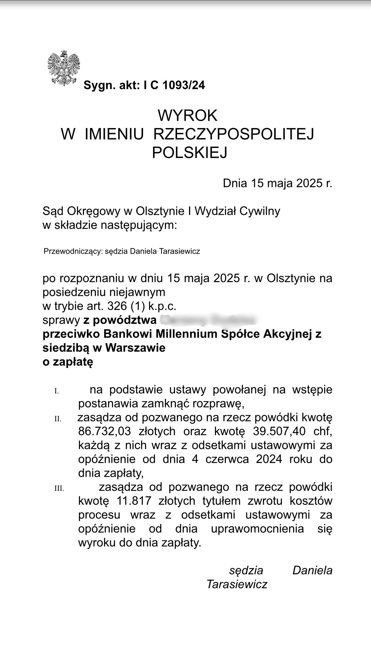 Sąd Okręgowy w Olsztynie I Wydział Cywilny wyrokiem z dnia 15 maja 2025 r., po rozpoznaniu sprawy z powództwa naszej Klientki przeciwko Bankowi Millennium S.A. zasądził od pozwanego banku na rzecz Klientki Kancelarii kwotę 86 732,03 złotych oraz 39 507,40 chf wraz z odsetkami ustawowymi za opóźnienie od dnia 4 czerwca 2024 r. do dnia zapłaty. Sąd zasądził również 11 817,00 złotych tytułem zwrotu kosztów procesu.