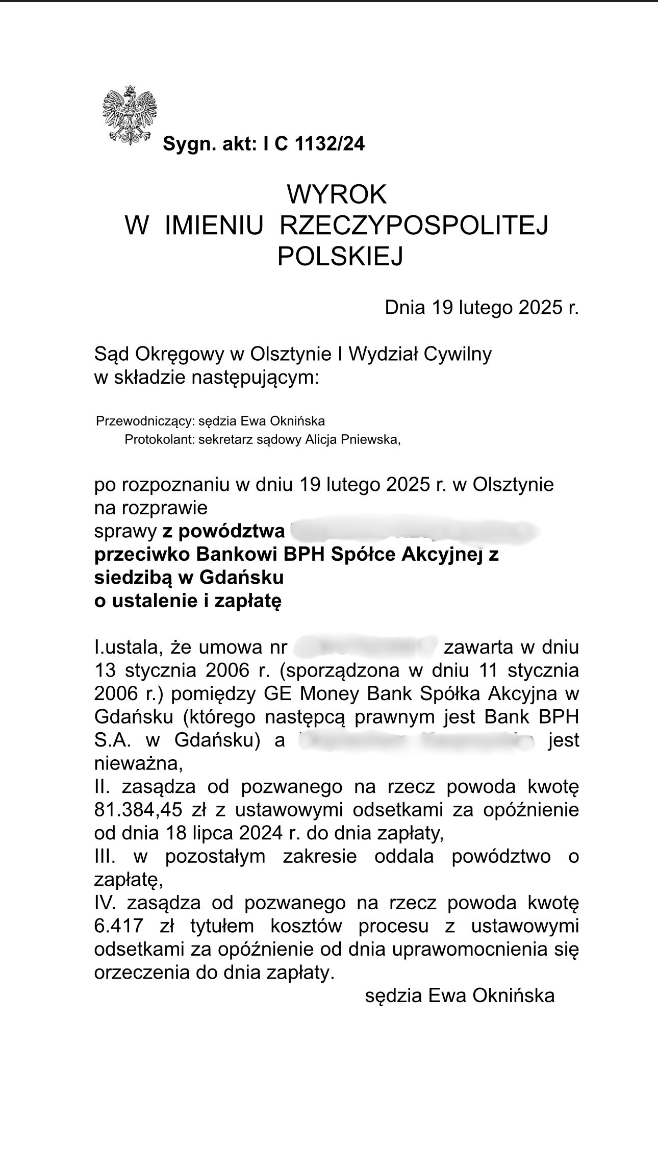 Sąd Okręgowy w Olsztynie I Wydział Cywilny wyrokiem z dnia 19 lutego 2025 r., po rozpoznaniu sprawy z powództwa naszego Klienta przeciwko Bankowi BPH S.A. zasądził od pozwanego banku na rzecz Klienta Kancelarii kwoty 81 384,45 złotych wraz z odsetkami ustawowymi za opóźnienie od dnia 18 lipca 2024 r. do dnia zapłaty. Sąd zasądził również 6 417,00 złotych tytułem zwrotu kosztów procesu.