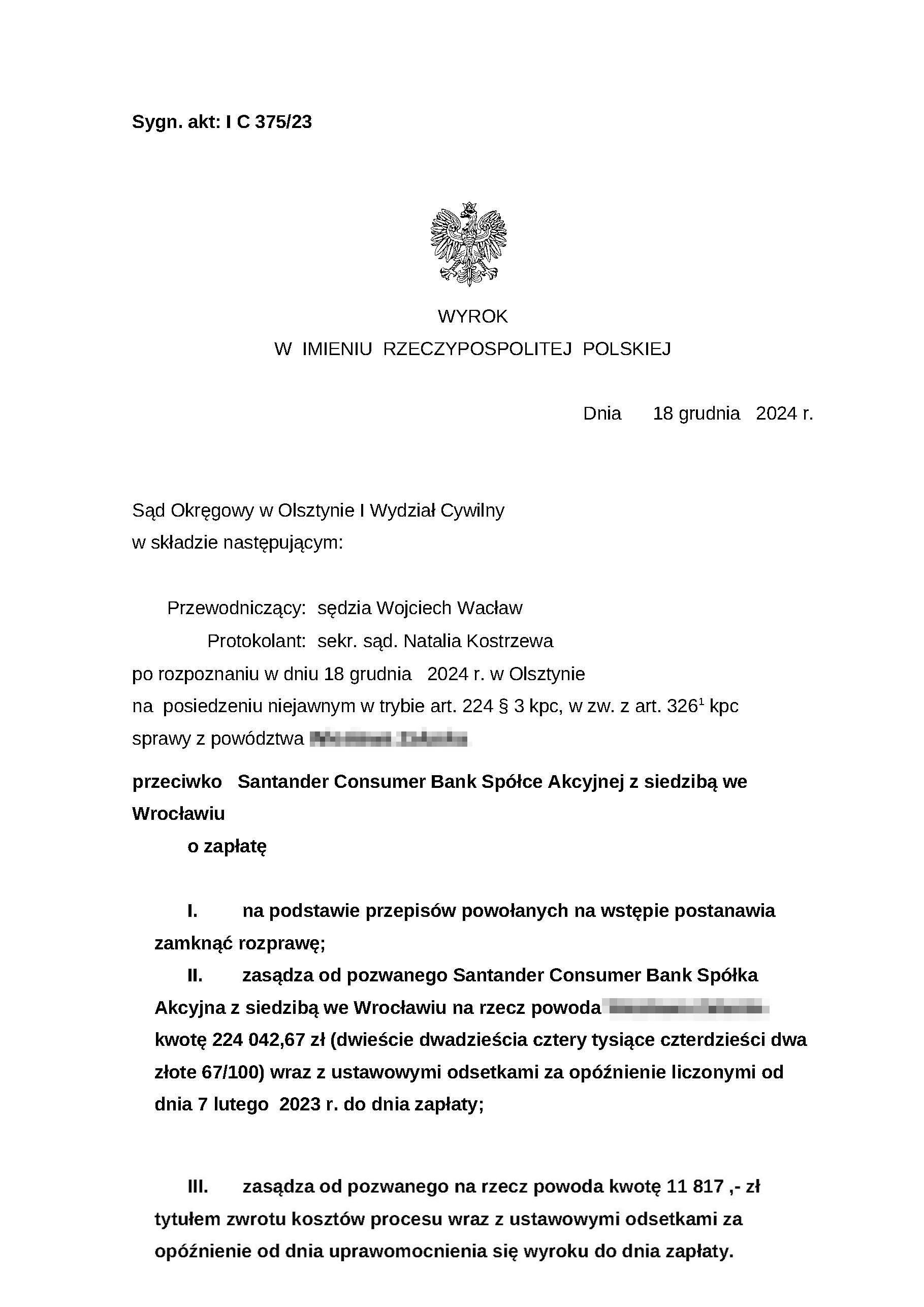Sąd Okręgowy w Olsztynie I Wydział Cywilny wyrokiem z dnia 18 grudnia 2024 r., po rozpoznaniu sprawy z powództwa naszego klienta przeciwko Santander Consumer Bank zasądził od pozwanego banku na rzecz Klienta Kancelarii kwotę 224 042,67 zł wraz z odsetkami ustawowymi za opóźnienie od dnia 7 lutego 2023 r. do dnia zapłaty. Sąd zasądził również 11.817,00 złotych tytułem zwrotu kosztów procesu. Sprawa dotyczyła spłaconego kredytu.