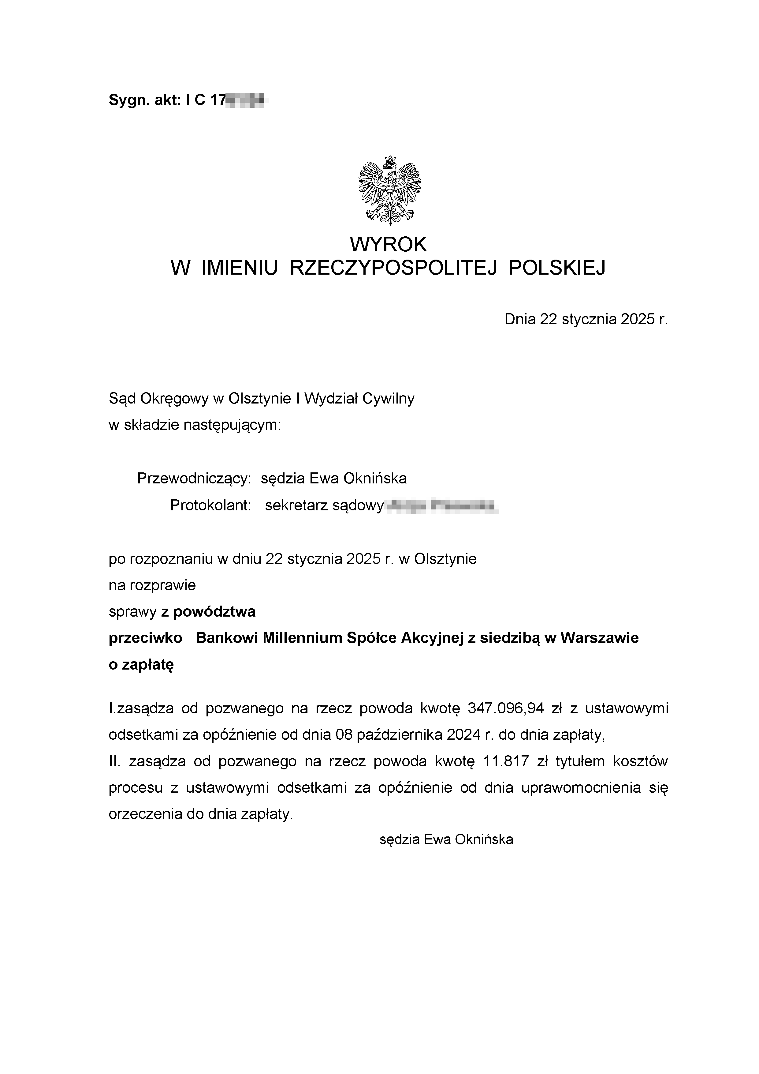 Sąd Okręgowy w Olsztynie I Wydział Cywilny wyrokiem z dnia 22 stycznia 2025 r., po rozpoznaniu sprawy z powództwa naszego klienta przeciwko Bankowi Millennium S.A. zasądził od pozwanego banku na rzecz Klienta Kancelarii kwotę 347.096,94 zł wraz z odsetkami ustawowymi za opóźnienie od dnia 8 października 2024 r. do dnia zapłaty. Sąd zasądził również 11.817,00 złotych tytułem zwrotu kosztów procesu. Sprawa dotyczyła spłaconego kredytu.