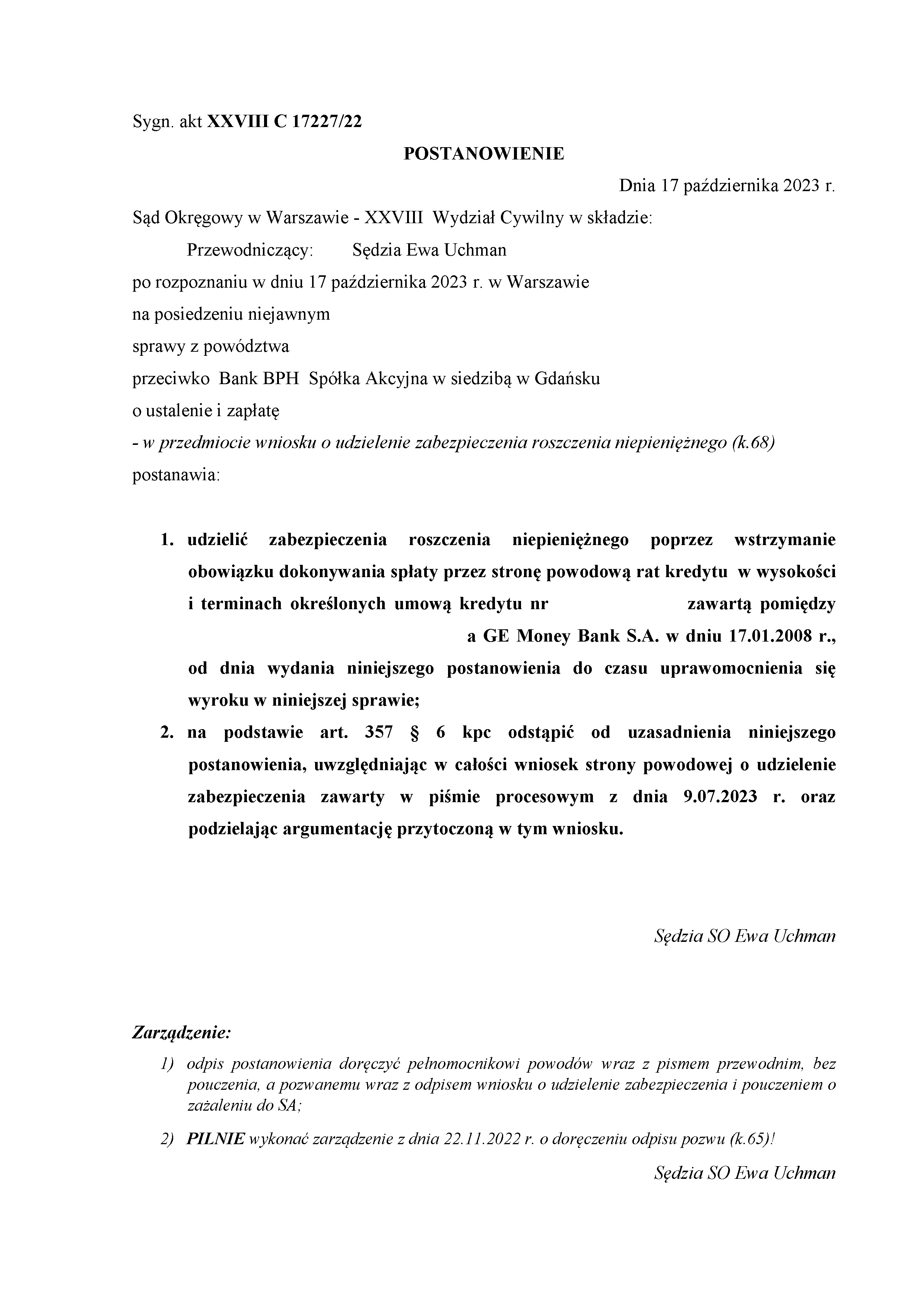 Sąd Okręgowy w w Warszawie - XXVIII Wydział Cywilny postanowieniem z dnia 17 października 2023 r., po rozpoznaniu wniosku naszych klientów o udzielenie zabezpieczenia roszczenia poprzez wstrzymanie obowiązku dokonywania spłaty rat postanowił udzielić zabezpieczenia roszczenia niepieniężnego poprzez wstrzymanie obowiązku dokonywania spłaty przez stronę powodową rat kredytu w wysokości i terminach określonych umową kredytu.